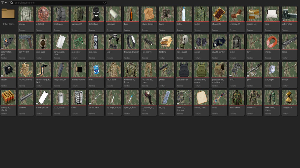 Пост будет посвящен меню инвентаря и связанным с ним объектам. Инвентарь разделен на 2 части: рюкзак, в котором хранится то, что нельзя использовать сразу, а надо предварительно из него достать(например флешки или продукты), и разгрузка\карманы — это то, что можно сразу же использовать во время игрового процесса(например аптечки или патроны). Некоторую сложность представляет собой создание дизайна интерфейса. Чтобы получился и красивым, но и без излишних наворотов, да еще и при этом не был похож на тысячи других интерфейсов из других игр. Дизайн все еще находится в процессе создания.