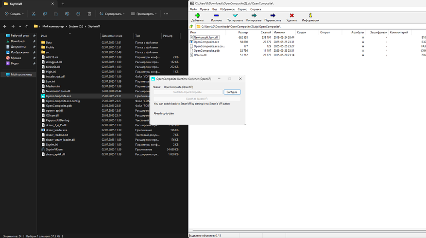 2. Открываем папку, где находится SkyrimVR.exe, и смело распаковываем туда OpenComposite Launcher. Запускаем его и нажимаем кнопку Switch to OpenComposite. Дожидаемся скачивания и установки всех вспомогательных библиотек.