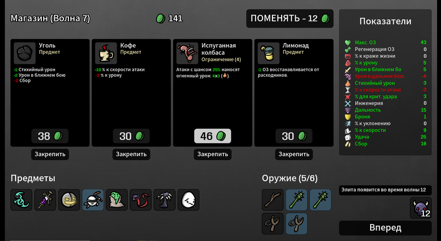 Артефакты самые разные, но почти у всех есть одна особенность: у них присутствует минус. Допустим, вы получите скорость передвижения, но придется заплатить регенерацией хп. Поэтому отрицательные показатели характеристик в Brotato - это норма.