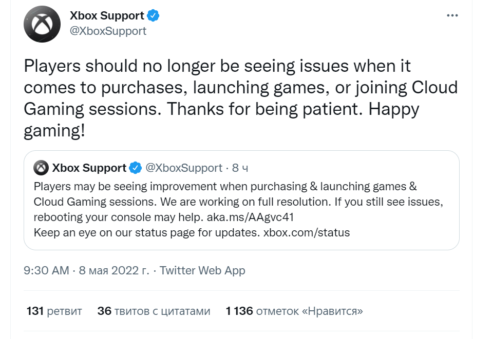 Впрочем, судя по комментариям пользователей, проблемы с сервисами Microsoft стали появляться ещё за сутки до этого, и тогда они затронули не только Xbox, но и пользователей Windows. В воскресенье утром техподдержка Xbox поблагодарила всех за терпение и сообщила, что сетевые проблемы окончательно решены.
