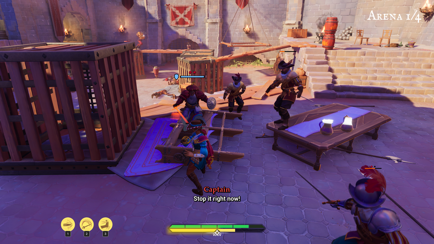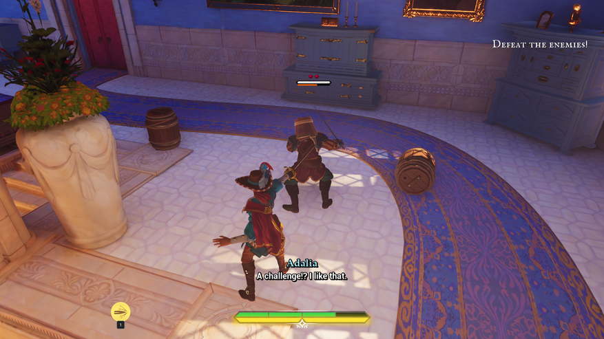 На базовый скелет фехтования наращивается довольно занятные взаимодействия с предметами и маневрирования по арене. Предметов относительно много, и они различаются по своему функционалу. Ящики, бочки можно пинать во врагов, чтобы оглушать их, заставать врасплох, скидывать с лестниц. Различные горшки, кувшины удивляют врагов, ведра кидаются на голову незадачливого противника, из-за чего он будет бездействовать, если его не трогать. Фонарь можно кинуть в стоящую пушку, чтобы она произвела выстрел. Или же в ящики и бочки с порохом. Бомбы кидаем в котлы и жаровни, чтобы зажечь фитиль. Причем котел после полета приземляется четко на голову врага, сразу ликвидируя его. Есть даже арена, где можно ликвидировать стражей в толпе, не вступая в бой, кинув фонарь в пушку!