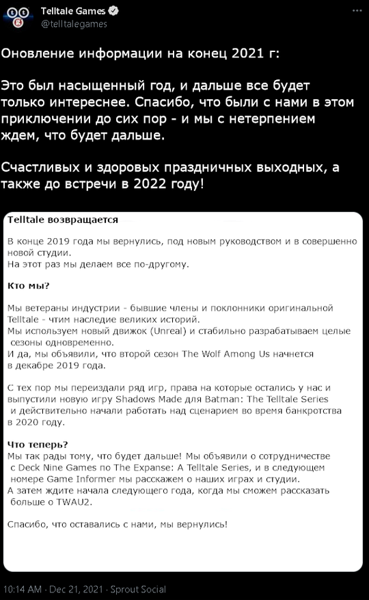 Компания Telltale Games официально подтвердила в своём Twitter аккаунте, что больше новостей о грядущей The Wolf Among Us 2 и будущих проектах компании сто́ит ожидать не раньше первого квартала 2022 г.