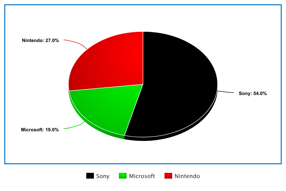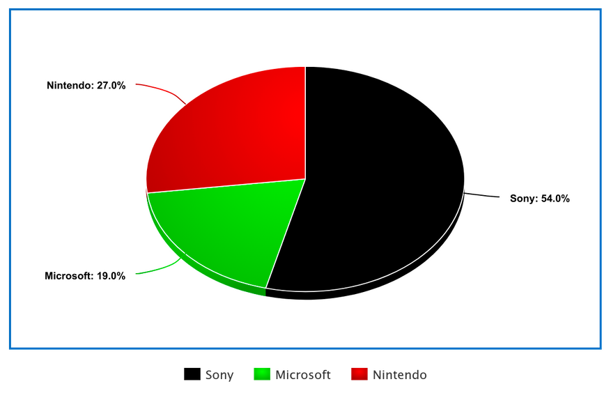 Начнем с хороших новостей для Sony. На данный момент по оценкам аналитиков компания контролирует невероятные 54% рынка игровых консолей! Это просто колоссальная цифра, которая ставит под сомнение здоровую конкуренцию в отрасли.