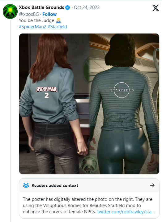 Информацией о начале новой необычной войны поделилось издание Kotaku. Недавно в сети один из пользователей Xbox опубликовал постер, где сравнил Мэри Джейн из Marvel's Spider-Man 2 и Андреа из Starfield со славами «Судить вам». И, как оказалось, это стало только началом. Другие пользователи стали развивать тему и в комментариях стали присылать скриншоты других популярных женских персонажей видеоигр, запечатлённых с определённого ракурса. После в этой же теме автора поста обвинили в том, что он использовал мод для улучшения попы Андреа. Пользователь отметил, что наиграл в Starfield более двухсот часов и запомнил, как она выглядела.