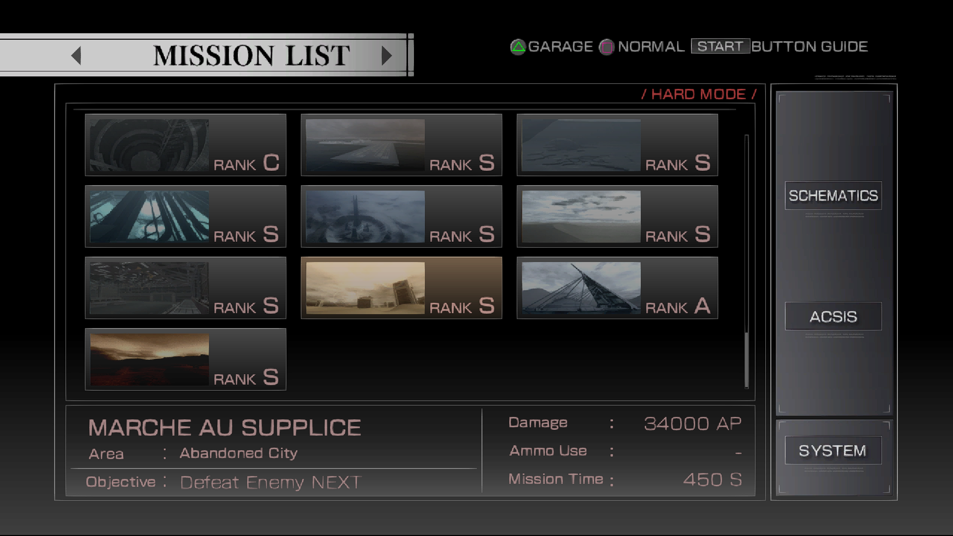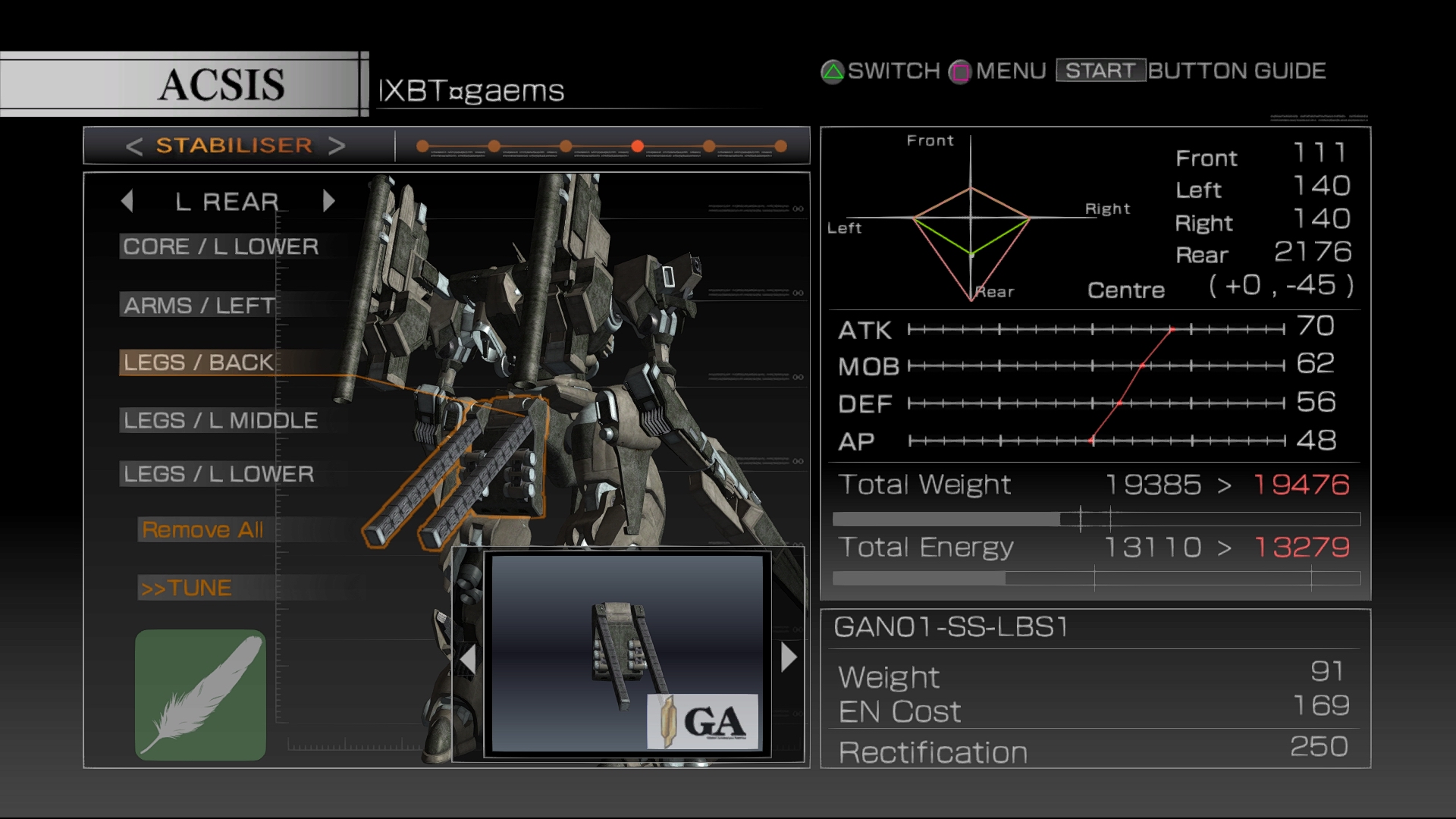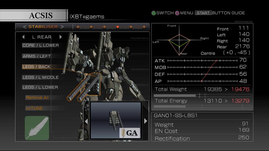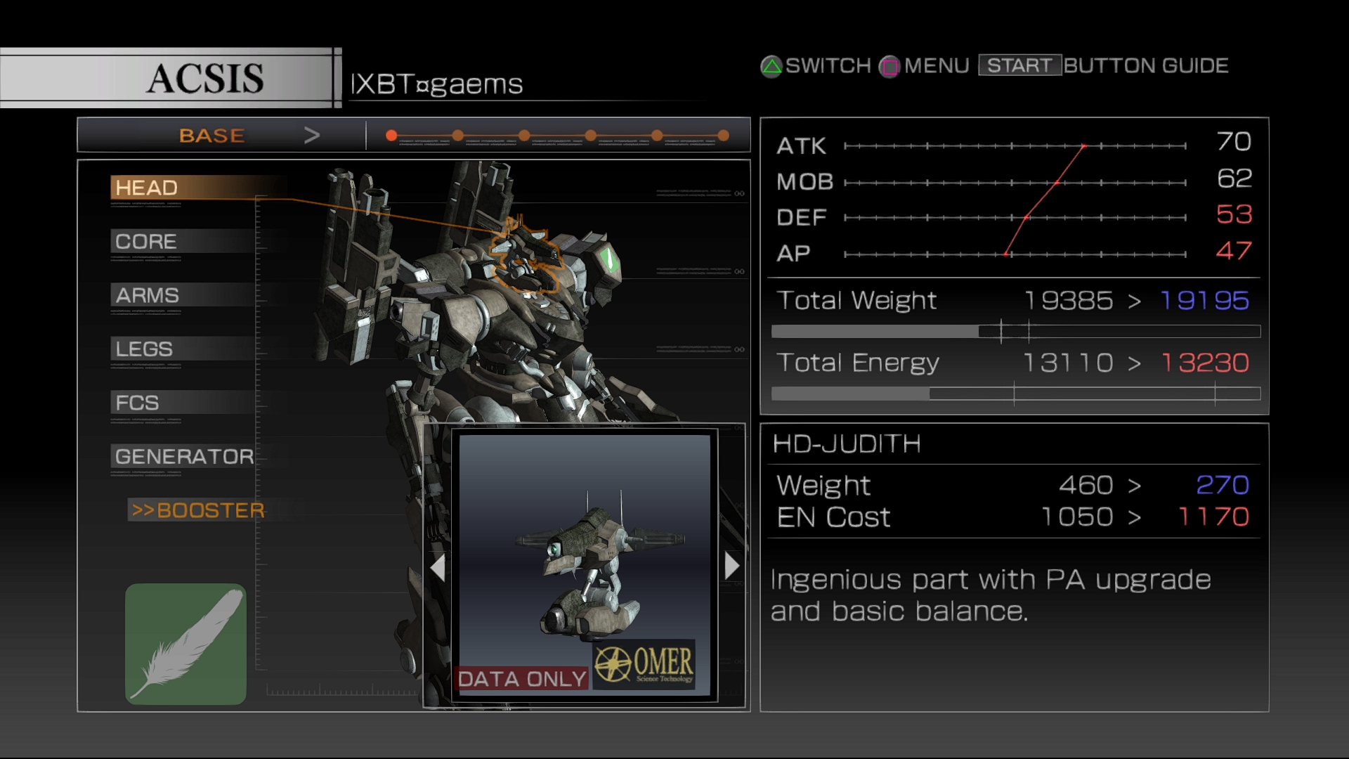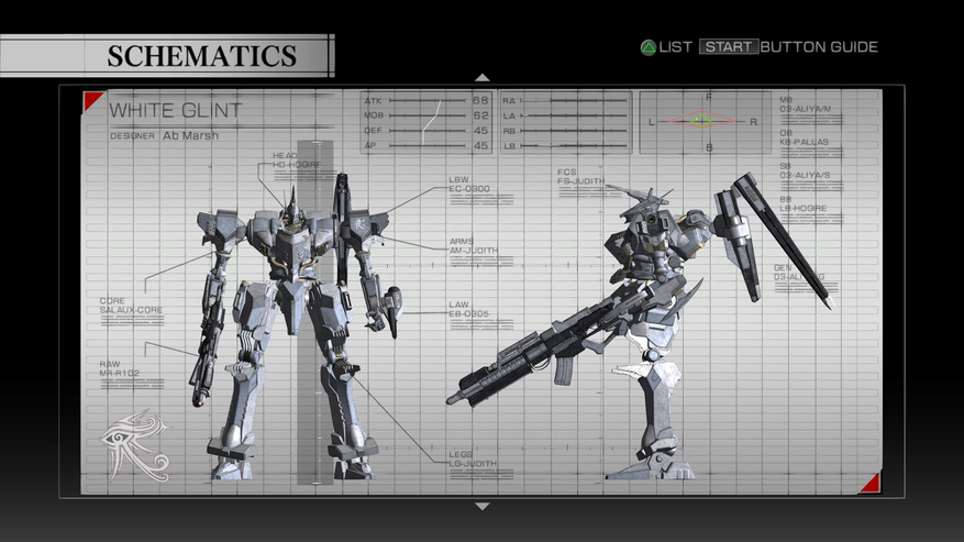 На концептуальном уровне, глубина настройки робота осталась в принципе той же. Только вместо радиатора у нас обвес, о котором позже, а вместо одного двигателя - целых четыре, отвечающих за движение робота в разные стороны. Генератор, бортовой компьютер и части тела робота остались на месте, тюнинг был вынесен в отдельное меню и теперь работает на отдельной валюте, которую мы зарабатываем получая более высокие ранги за пройденные миссии. Возможности по раскраске машины и оружия были расширены, а создать собственную эмблему стало гораздо легче. Отдельные виды оружия были упразднены (огнеметы например), зато были добавлены новые, вроде ружья, стреляющего частицами Кодзимы. В какой момент истории Кодзима стал настолько гениальным, что открыл новый химический элемент, игра нам не рассказывает. Возможно об этом написано в японском артбуке. Так же в игру добавили систему схем, но детально разбираться я в ней не стал. По сути она заменяет возможность держать несколько разных сборок в гараже одновременно, но пользоваться ей очень неудобно.