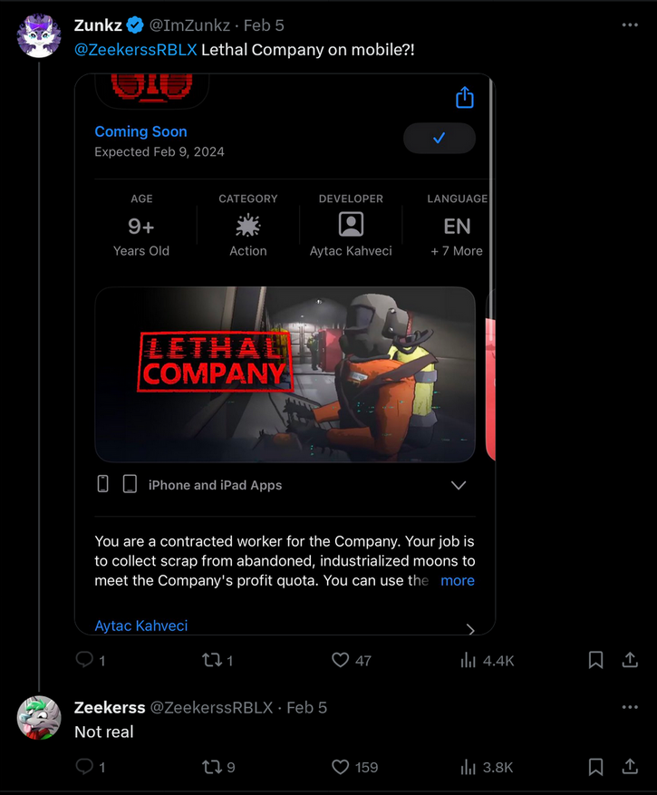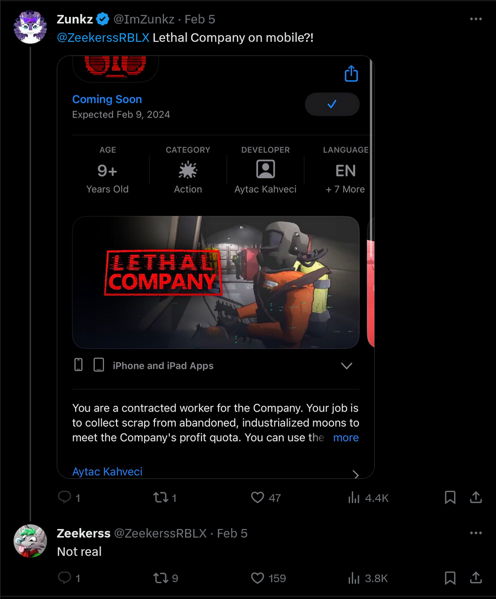 Страница игры дословно копирует описание из Steam, в том числе скриншоты. А в самой игре частично воссоздана часть функционала полноценного проекта. Разработчик Lethal Company под ником Zeekerss уже подтвердил, что мобильная версия игры является подделкой. К слову, в Google Play Market таких уже две.