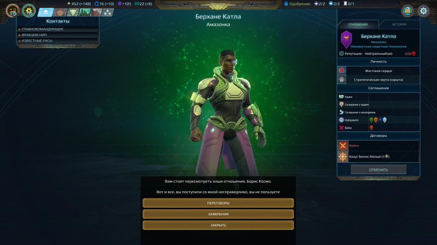 Но в том-то и засада! Внезапно (как всегда) выяснилось, у амазонки был скрытая черта характера под названием «Жестокое сердце». Обладателям этой черты, по сути, и не требуется повода для войны. Вернее, ограничения по казус-бели становятся минимальными. По итогу на 19-ом ходу Барахне оскорбила Бориса, чтобы снизить уровень отношений, а на следующий ход выслала формальное уведомление о начале войны.