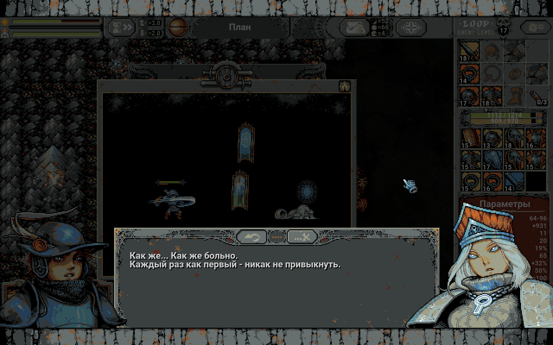 Интересно, необычно, залипательно, но не совсем моё. Слишком много времени здесь приходится тратить на добычу ресурсов и довольно много решает рандом. В этом, конечно, тоже есть доля фана. Всё-таки игра заставляет быстро принимать решения и адаптироваться на ходу, но немного разочаровывают неудачные попытки, которые происходят не всегда по вине игрока. Тем не менее, время за Loop Hero пролетает незаметно, игра действительно расслабляет и позволяет отвлечься от насущных дел, но с этим прекрасно справляются и более привычные жанры. В любом случае, если есть желание попробовать что-то новое, то Loop Hero отличный кандидат. Игра прекрасна в своем визуальном минимализме, но при этом предлагает довольно глубокий игровой процесс с простором для экспериментов. В этой игре скорее прикольно разбираться, чем пытаться её проходить. Вряд-ли я когда-нибудь к ней вернусь, но впечатление она оставила скорее положительные. Если бы не унылый гринд и потеря ресурсов, то было бы совсем хорошо. С другой стороны, эта игра прекрасная альтернатива Солитеру, например.
