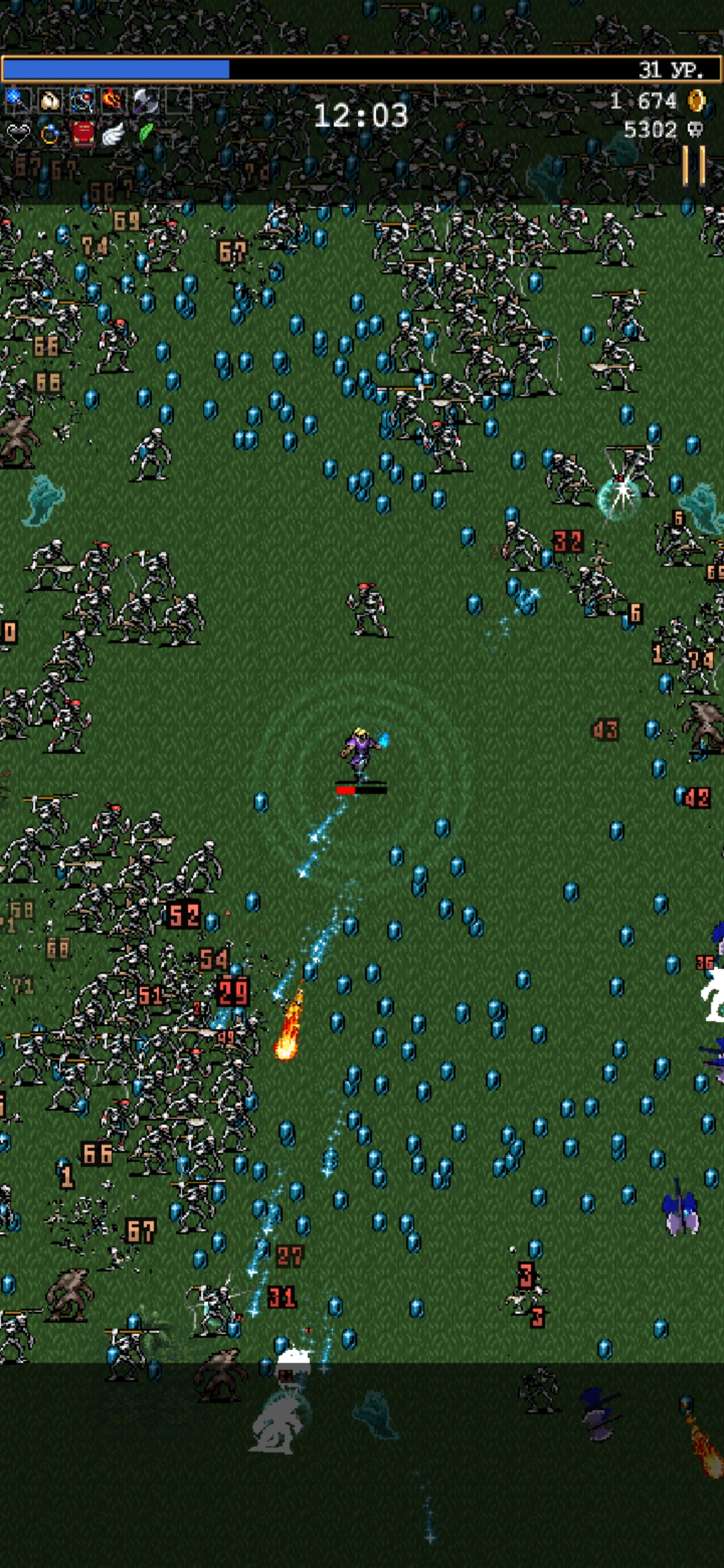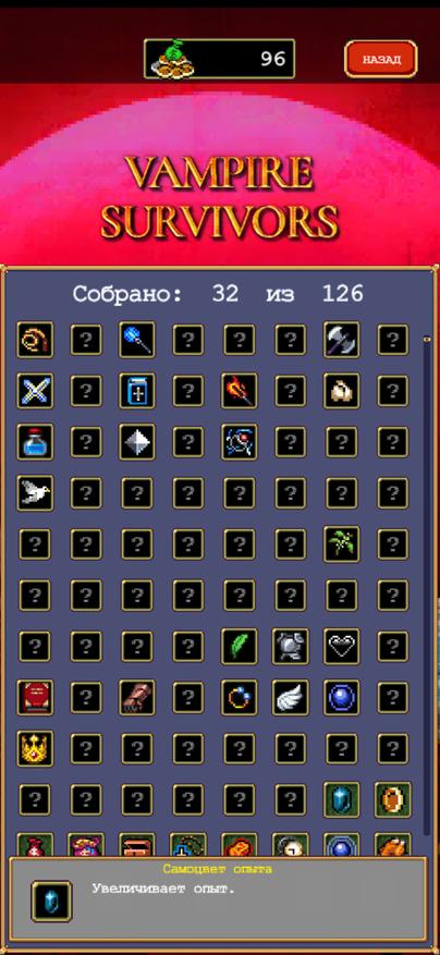 Я играю пару десятков часов, но начал немного разбираться. Усиления я прокачивал разные, но в итоге пересмотрел приоритеты и сбросил их. Делается это бесплатно и всё золото вы можете потратить заново, что открывает дополнительные возможности. Не понравился набор? Поменяй. В итоге я закупил всё заново. "Магнит" прокачал на максимум, ведь он обеспечивает сбор очков опыта на расстоянии. "Боезапас" можно купить один раз, он стоит дорого, но добавляет дополнительный снаряд каждому оружию, что очень полезно. Нашёл кнут на поле боя, а с "боезапасом» он будет бить с двух сторон. Естественно, необходимо "развитие", что ускоряет прокачку и получение нового уровня. Ещё я взял усиление урона и повышенное получение золота. Когда накоплю, куплю "оживление", которое позволит продлить забег. Некоторые усиления можно встретить во время забега, они действительны только на его время. Очень полезны такие предметы как: вакуум, который собирает все кристаллы опыта на карте; "часослов" замораживает всех противников на несколько секунд; местный огнемёт испепелит кого угодно, но доступен лишь на короткий промежуток времени.