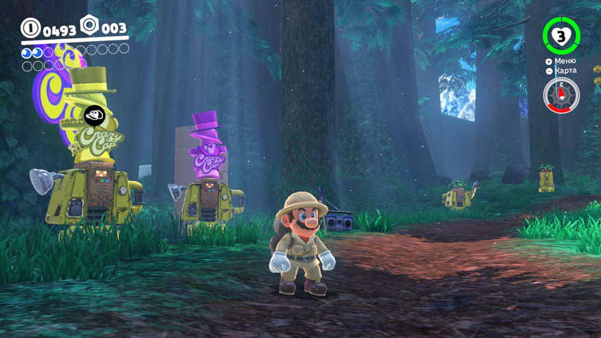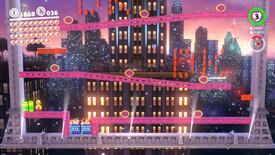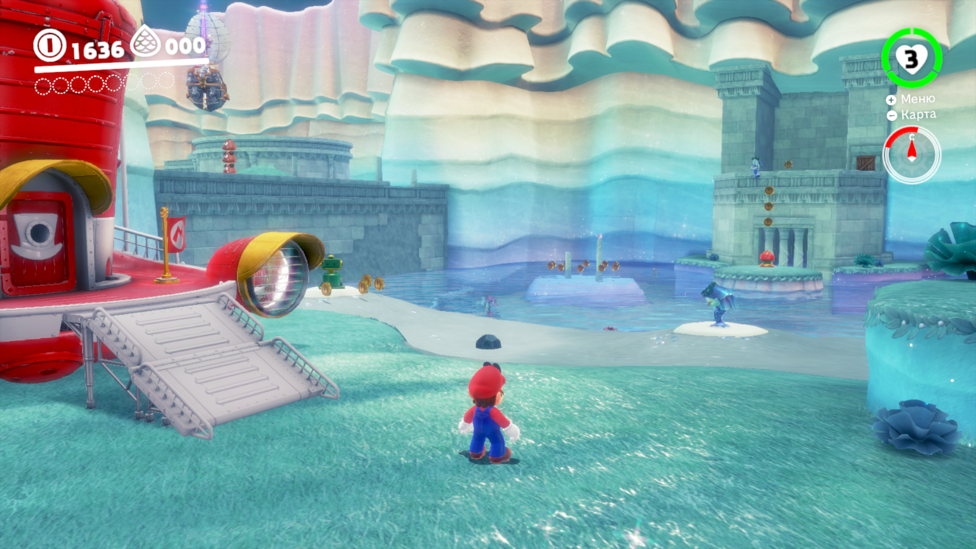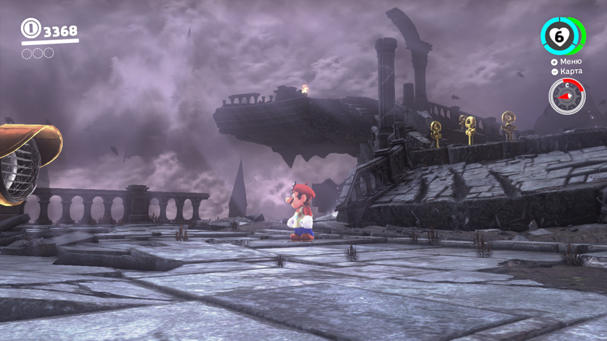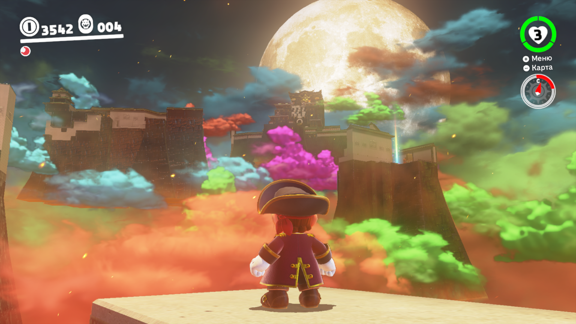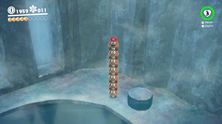 За успешное выполнение сюжетных и побочных заданий, за прохождение дополнительных уровней и нахождение тайников Марио получает луны, аналог звёздочек из прошлых частей. Вообще говоря, обычно нужно собрать как минимум штук десять-пятнадцать лун в королевстве, чтобы иметь возможность продолжить путешествие, своеобразная стена гринда. Однако найти этот минимум не составит труда, причём почти каждая из них спрятана в каком-то интересном месте, и когда ты находишь эти луны, ты получаешь новые заряды радости. В принципе, в этом и суть игры — собирать луны, исследуя локации и копаясь в каждом углу. Я, как рядовой игрок, находил почти в каждой локации около трёх десятков лун, всего за игру накопилось штук триста-четыреста.