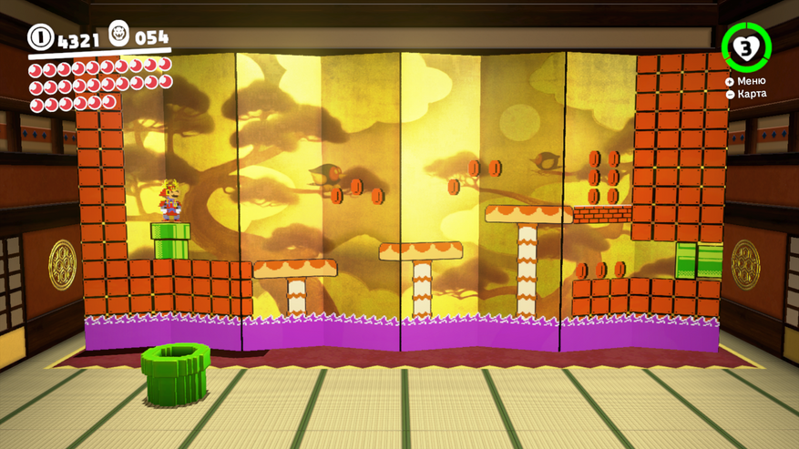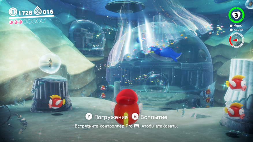 Особенно хочу упомянуть про двухмерные пиксельные мини-уровни. Они являются не только хорошим фансервисом, но и меняют игровую реальность. Плаваешь ты в море в рамках пляжного царства, собираешь на дне предметы, сражаешься с рыбками, а потом находишь зелёную трубу. Ныряешь в неё, и вот Марио уже пиксельный, а всё дно это целый пиксельный уровень. Ты прыгаешь по этим пиксельным платформам, делаешь что-то, а поверх твоей пиксельной арены плавают те же рыбки и лежат ракушки, как ни в чем не бывало. Очень интересно всё это выглядит.