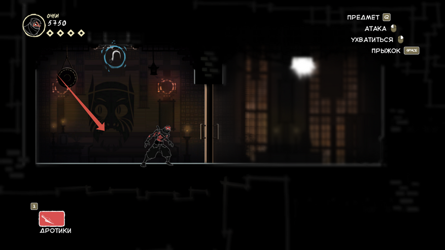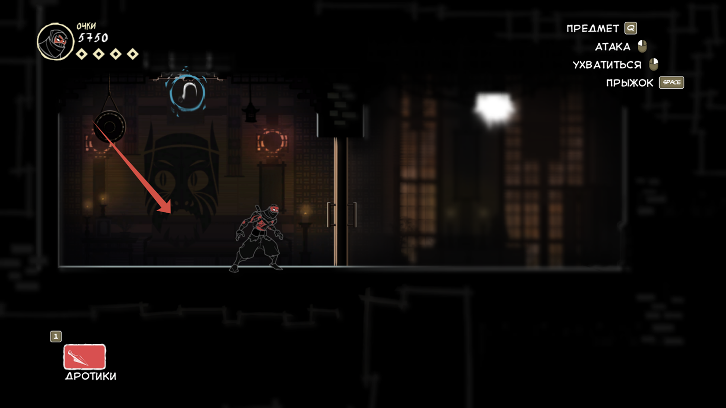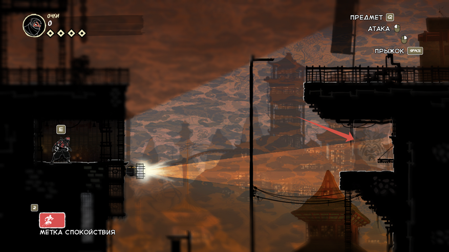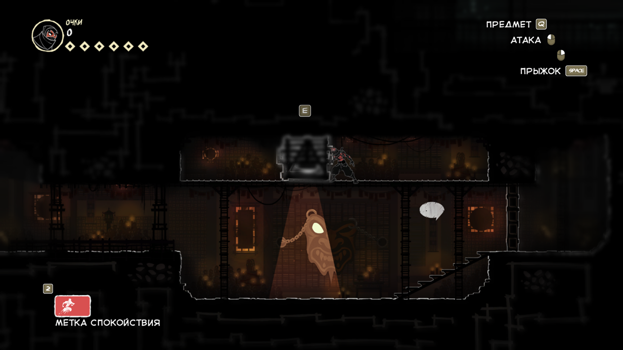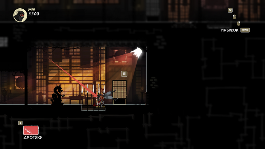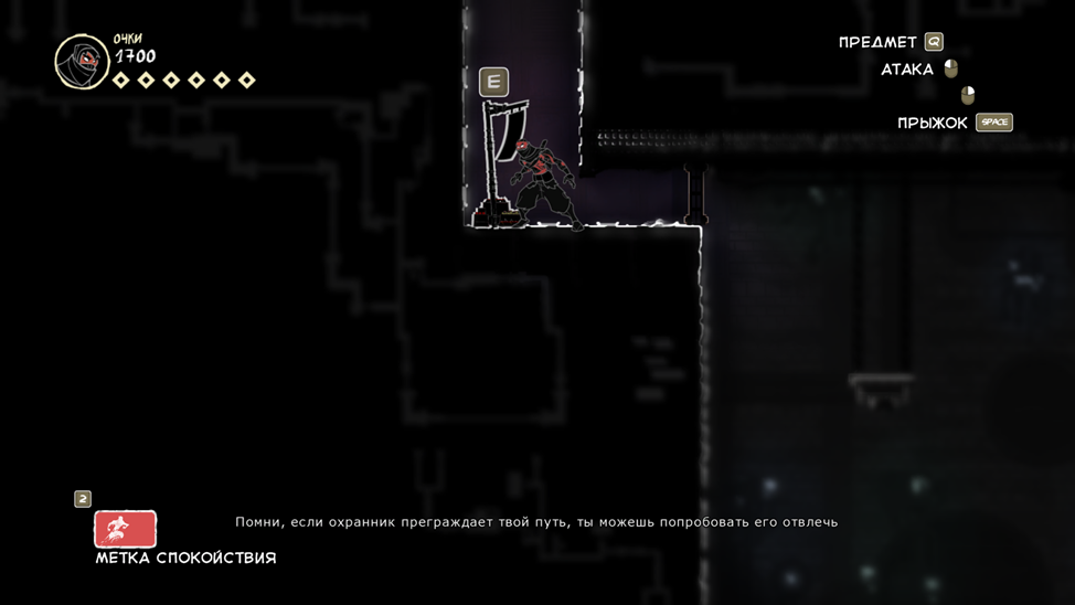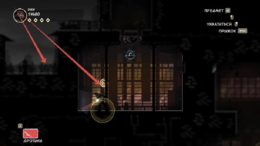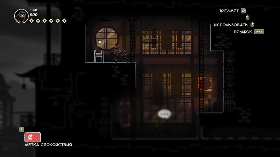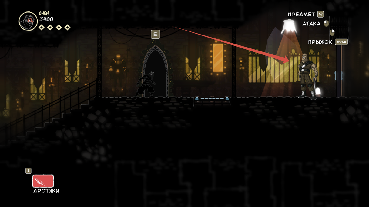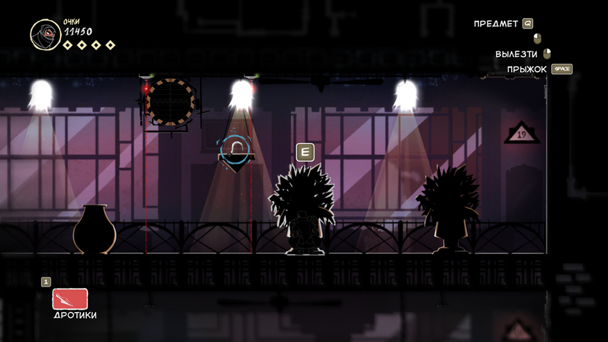 Так же есть клавиша E (продублирована право кнопкой мыши), она подсвечивается при возможности взаимодействовать с объектом. Конкретно сейчас на скрине ниндзя спрятался за цветочным горшком.