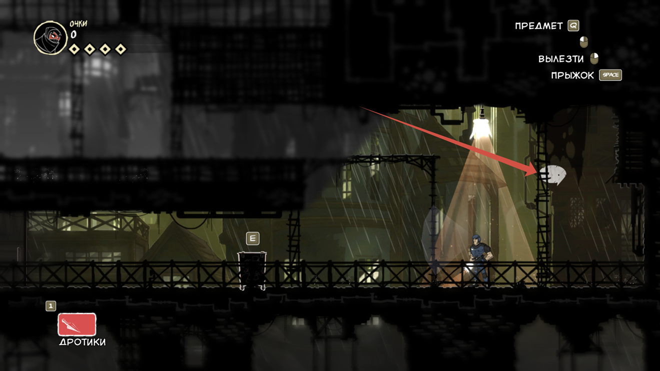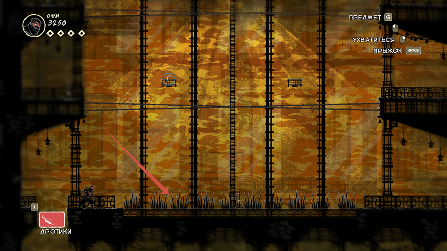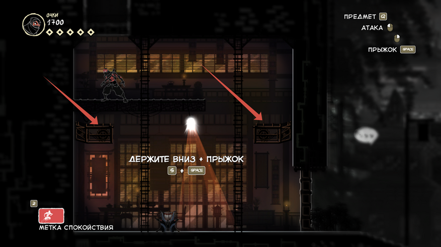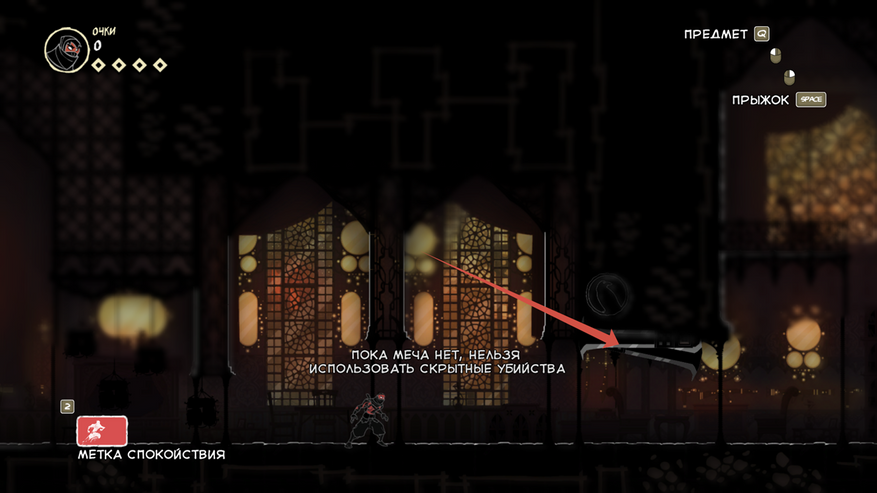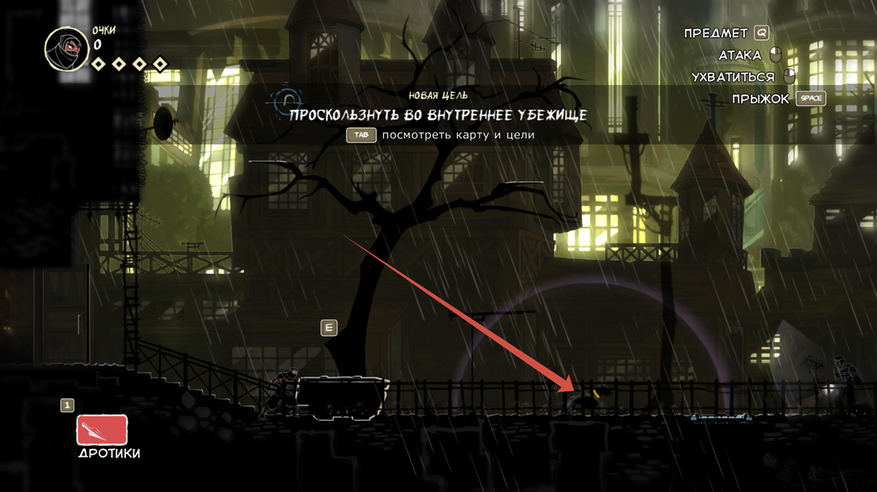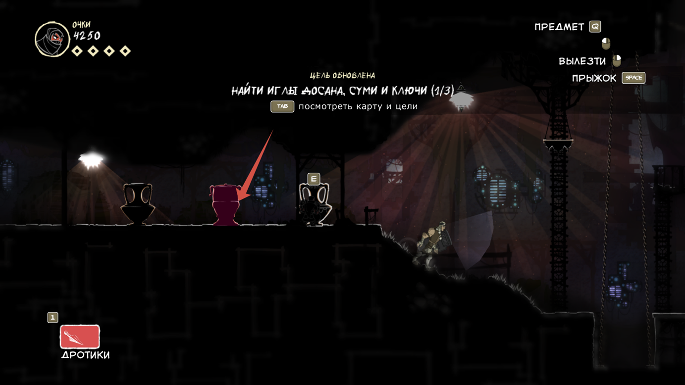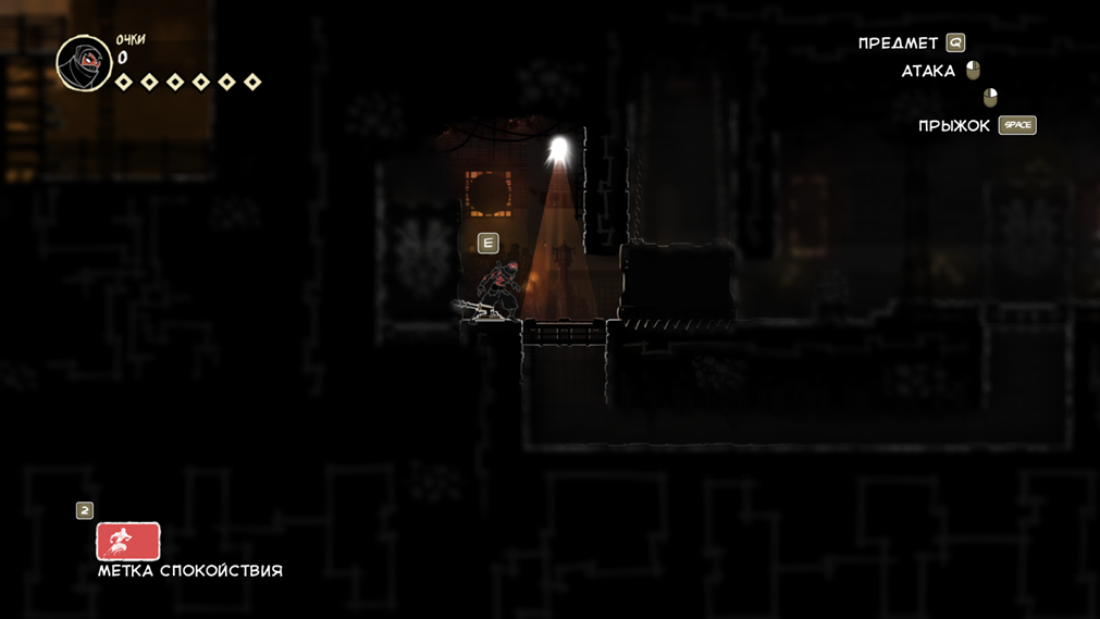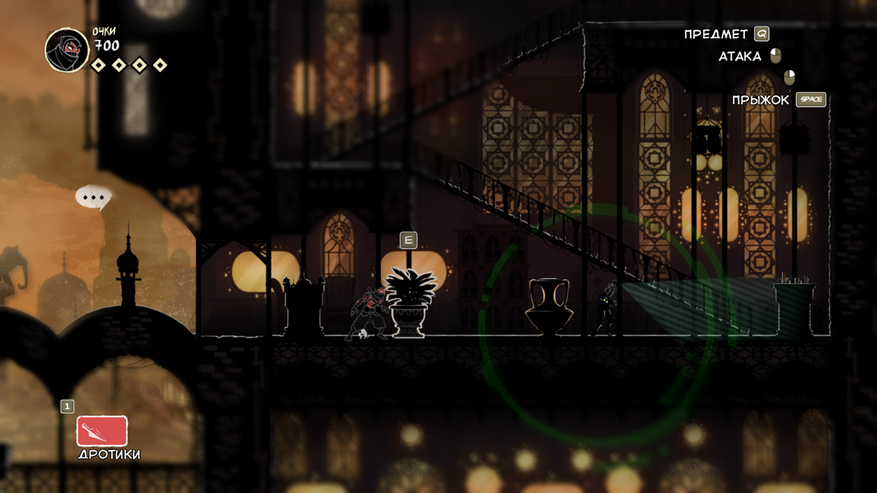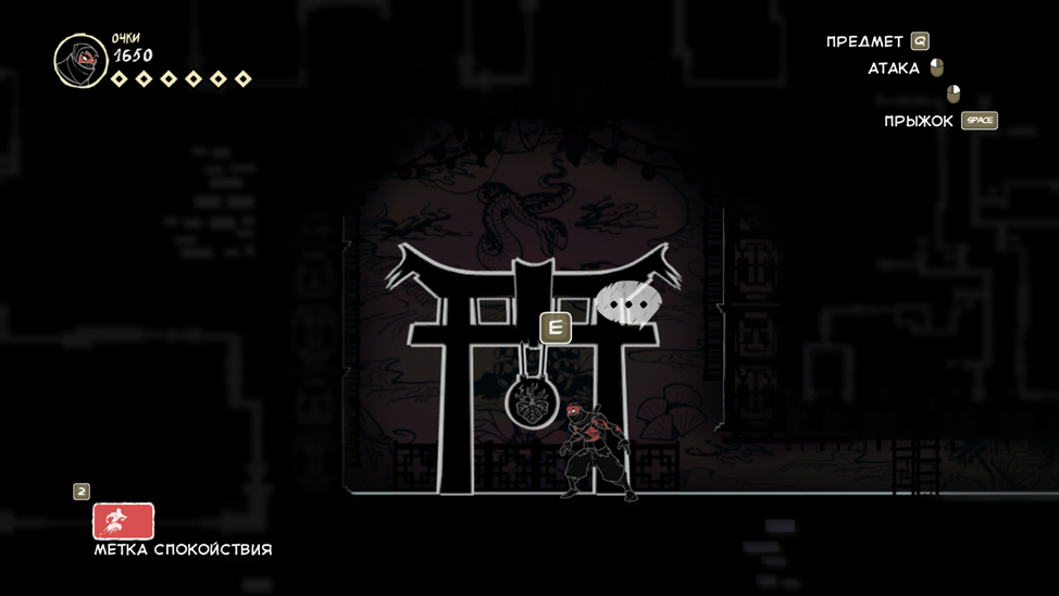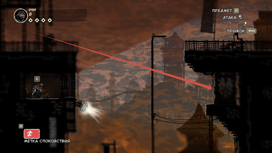 Так же есть клавиша E (продублирована право кнопкой мыши), она подсвечивается при возможности взаимодействовать с объектом. Конкретно сейчас на скрине ниндзя спрятался за цветочным горшком.