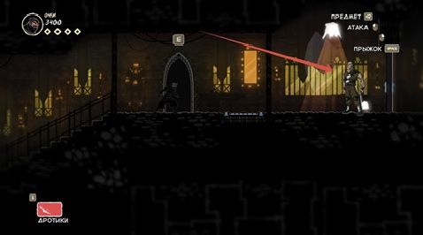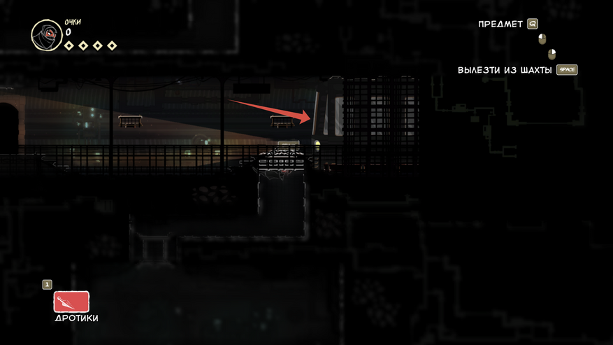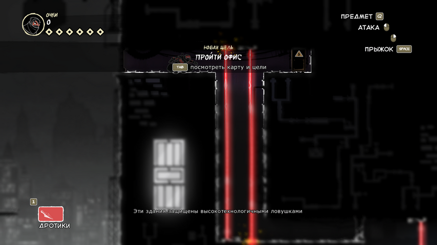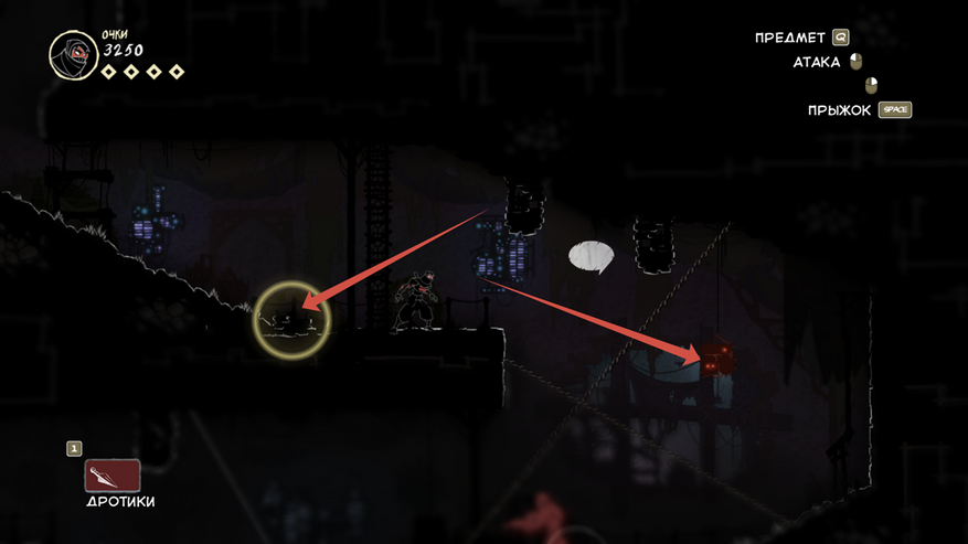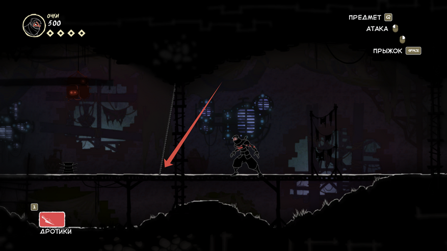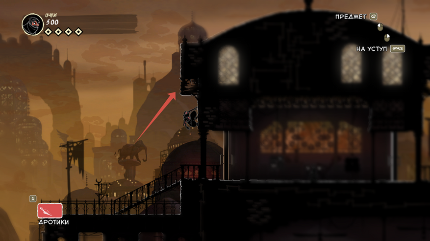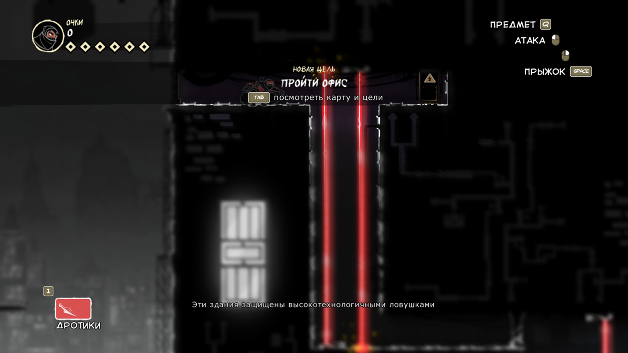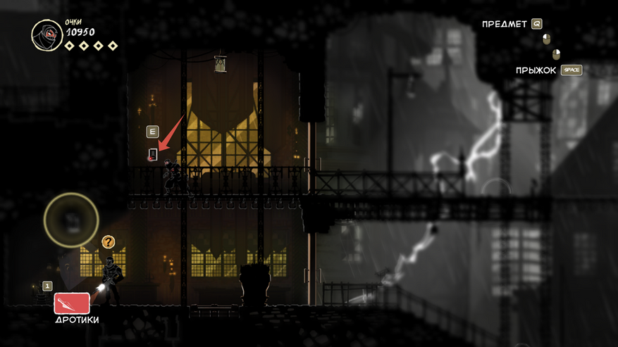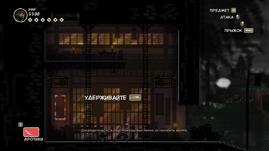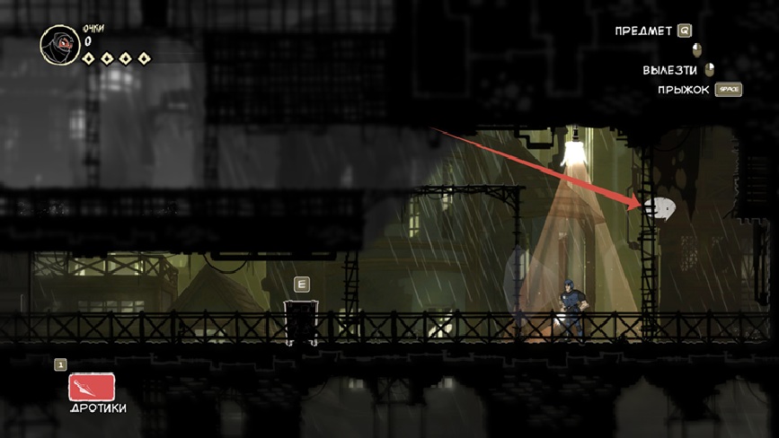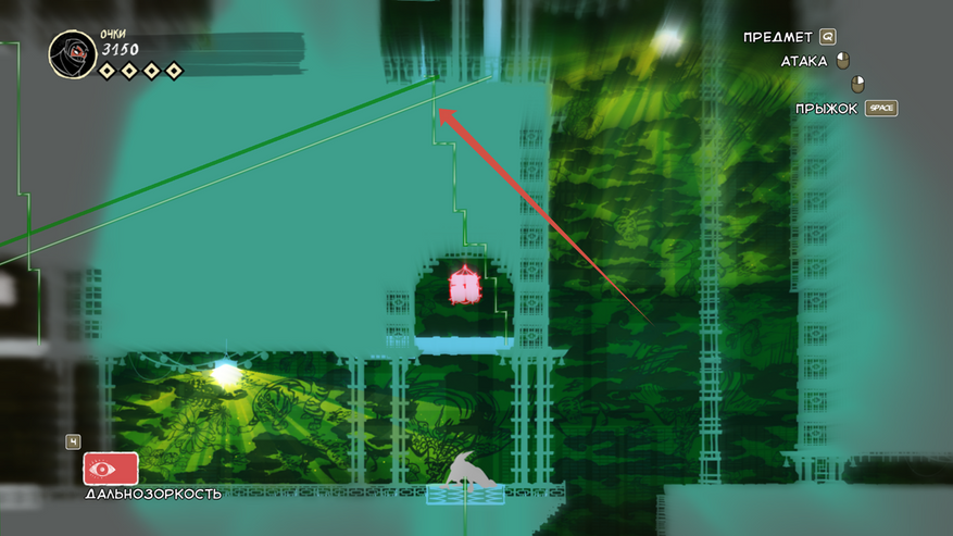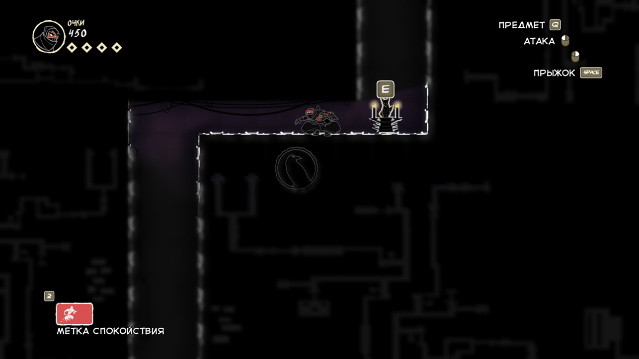 Так же есть клавиша E (продублирована право кнопкой мыши), она подсвечивается при возможности взаимодействовать с объектом. Конкретно сейчас на скрине ниндзя спрятался за цветочным горшком.