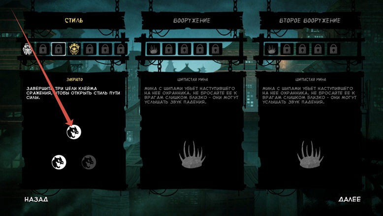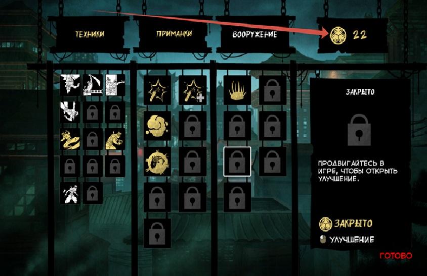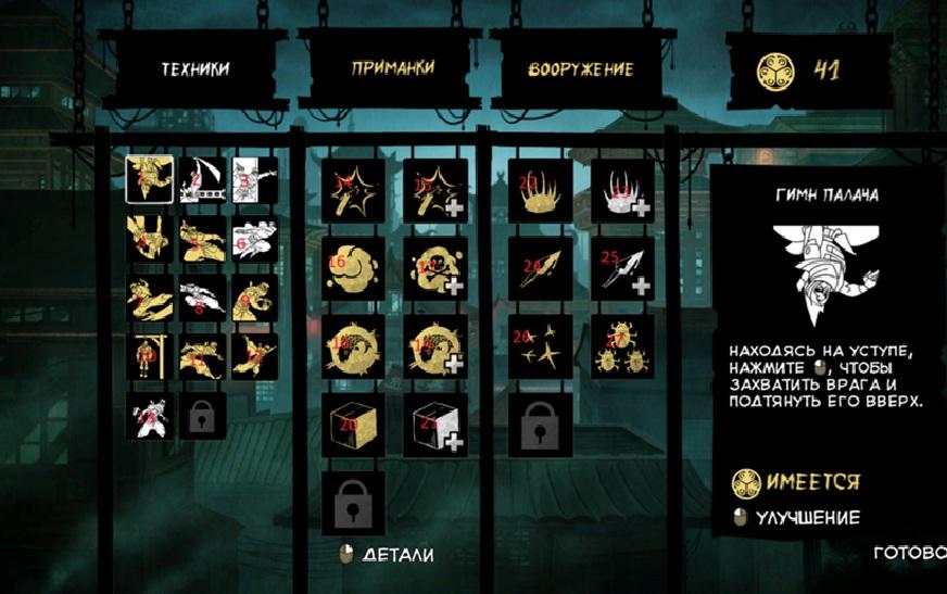 Посмотрите как удобно оформлен интерфейс. Есть чёткое разделение на типы приёмов и снаряжения, их детальное описание справа при выборе. Вверху обозначены монеты для улучшений (их получаем проходя те 9 испытаний на каждом уровне). Жёлтые это прокачанные навыки, белые нет