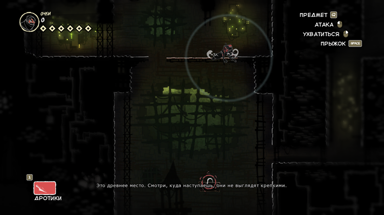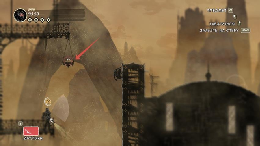 Так же подсвечивают синим цветом интерактивные объекты, к которым можно притянуться крюком (если цвет красный, то после притягивания к объекту он скоро разрушится и надо быстро покинуть эту платформу).