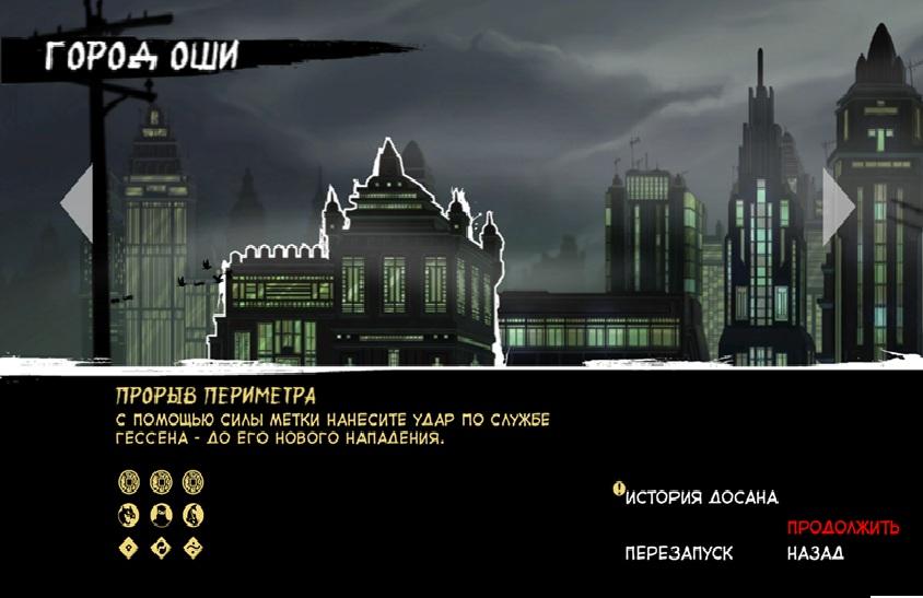 5 «Лёгкая тень» убийства врага из укрытия (здесь та самая вторая ошибка гейм дизайна. Я проходил игру без убийств, но в каждой локации есть испытания например «убей 3-х врагов находясь на потолке». Сначала выполнял их и игра после прохождения засчитывала выполнение задания. Потом перезапускал уровень и проходил без убийств. Из-за этого навыки связанные с убийствами практически не качал и однажды было задание, как раз на последней миссии: «Убей врага находясь в укрытии», а я эту способность не качал! Теперь после написания статьи мне придётся прокачать навык и снова пере проходить уровень! И это ошибка не игрока, а гейм дизайнера. Неужели нельзя перед началом миссии написать «Для выполнения испытания на этой локации вам потребуются навыки «Лёгкая тень» и … рекомендуем их прокачать». Всё, никаких бы проблем не возникло (можно в коде прописать так, что появится надпись, если нет навыка). А лучше вообще, при выборе локации, показывать не только 3 иконки обозначающие испытания, но и описание к ним, сейчас иконки не информативны.