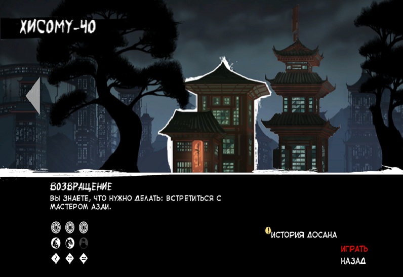 Подобный интерфейс отличное решение. Игрок может пройти уровень, потом вернуться в игру посмотреть, какие испытания пройти не смог, и заново перезапустить уровень. Здесь однозначно Пятёрка в зачётке. Тут ещё есть пункт «История Досана», это дополнительное издание, которое я пока не прошёл оно открывает новую экипировку и костюмы.