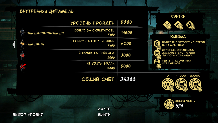 Обратите внимание, что за бескровное прохождение уровня дают 8000 очков.