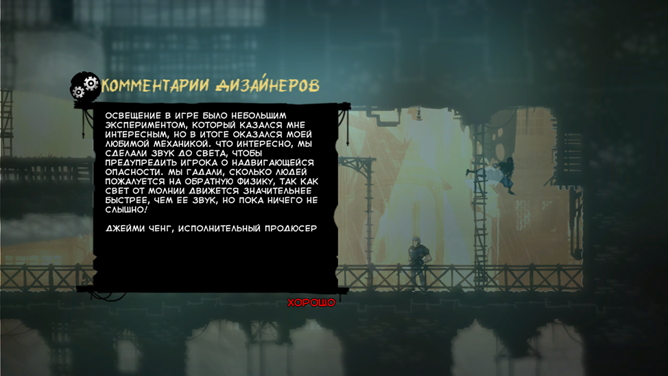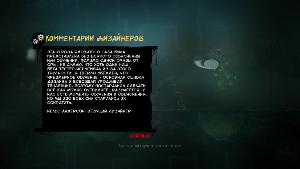 При включении функции в меню «Комментарии», на уровне появляются облачка. Если по ним кинуть кунай, появятся комментарии разработчиков о истории создания игры (отличное решение).