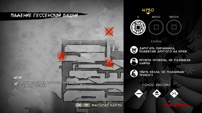 На первом мы видим статистику, которая отображает наш счёт за умение скрываться от врага, бесшумные убийства, спрятанные трупы, найденные бонусы и свитки, очки за отвлечения врагов гонгов и прочее. А фигурки солдат отражают их конкретные реакции на вас (заметил, тревога, убит…).