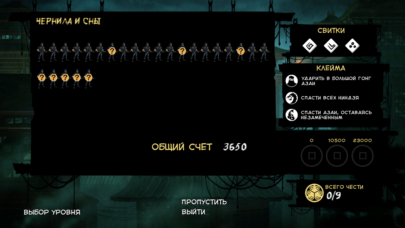 На втором общий итоговый счёт, где указаны дополнительные бонусы, за то что никого не убил, ни разу не попался на глаза, выполнил испытания и собрал свитки.
