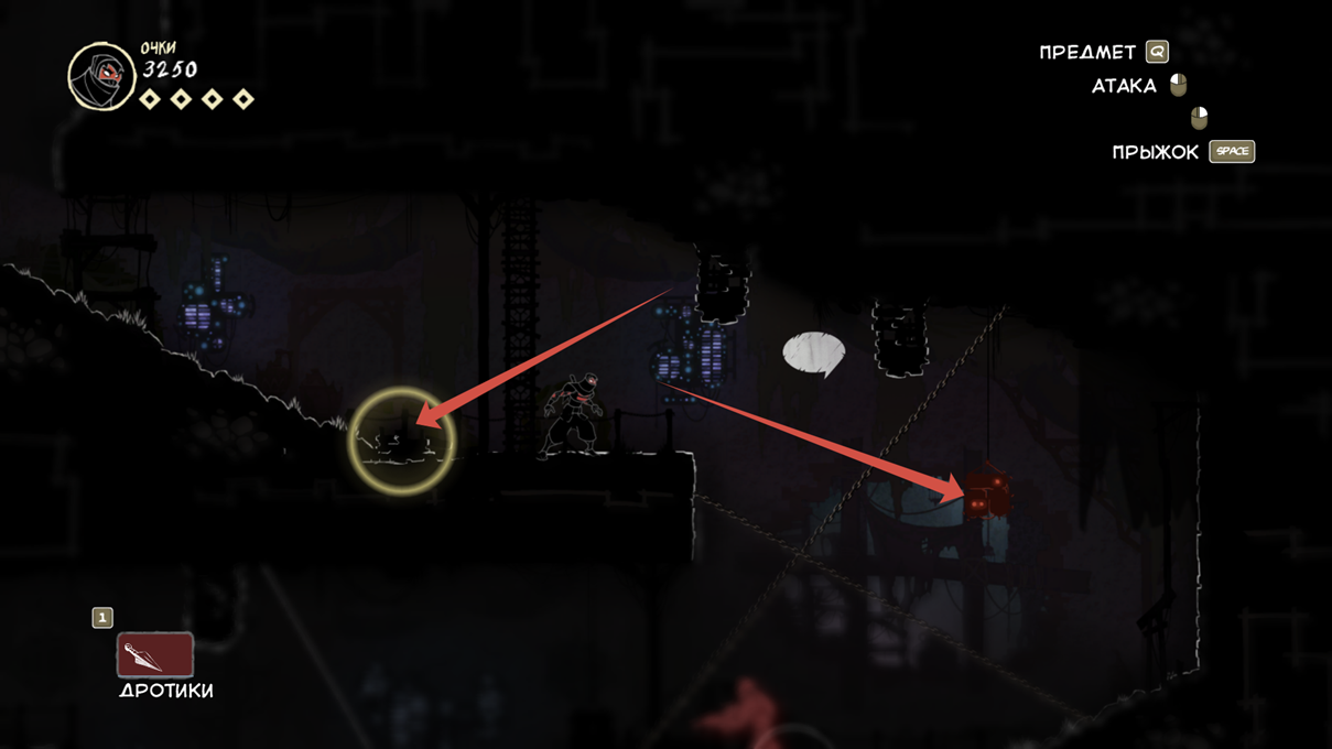 Так же звук издают интерактивные предметы, вроде гонга и колокола, для отвлечения внимания врага. Помимо этого звук издают разбиваемые фонари, кунаи попавшие в пол или стены, брошенные шипастые мины, платформы, на которые вы запрыгиваете с помощью цепи (помечены синим или красным значком как писал выше). Здесь на скрине синим кругом обозначен шум от подвесок, в которые персонаж кинул кунай, и все враги в этом радиусе сбегутся посмотреть, что случилось. А жёлтым кругом обозначено место, куда они сбегутся и там начнут шарить фонарями ища врага.
