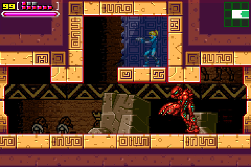 Сложности в быстром прохождении осталась те же самые, что и у Fusion: количество времени вновь впритык, а некоторые загадки со способностями и с импульсом стали ещё сложнее в выполнении. Наверное (пока Metroid Dread я не трогаю), у Zero Mission самые тяжёлые головоломки во всей серии. Кроме этого в самом забеге есть детали, которые вызывают вопросы. В большей степени это касается Чозодии. Разработчики специально дают новую способность в самом конце игры, из-за чего ради лучшей концовки потребуется, минимум, дважды пробежать локацию и покинуть её ради пары секретов. Под эту задумку в старые зоны даже добавлены новые проходы, чтобы ушло как можно меньше времени на переходы между ними.