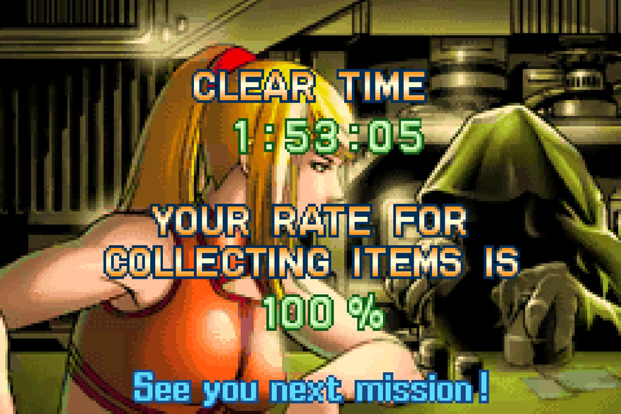 И в конце параграфа про суть игр. Во время написания первой части этот момент я, к моему сожалению, опустил. Цель игрока не просто победить финального босса и сбежать из его логово до того, как оно исчезнет с лица вселенной, но и оптимизировать своё прохождение так, чтобы уложиться в определённое время: от двух до четырёх часов (в первой части и вовсе 60 минут). От скорости и потраченных часов зависит облик Самус в сцене после титров. Получить лучшую концовку с первой или со второй попытки вряд ли выйдет, даже если знать оптимальный маршрут наизусть. Дело в том, что разработчики Metroid вставляют в прохождение некоторые условности, чтобы у игрока было меньше шансов уложиться в срок.