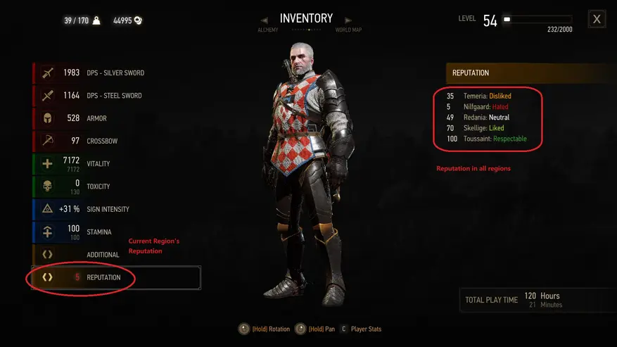 После установки модификации, в пяти регионах доступных для полноценного исследования, всё что будет делать Геральт, будет иметь последствия. Убийство чудовищ, выполнение контрактов, спасение людей будет положительно сказываться на его репутации. А вот, драки, кражи, стычки со стражниками репутацию ухудшат. Решение принятое в некоторых квестах так же будет влиять на общую репутацию.