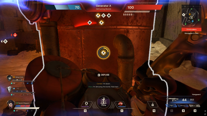 Механика подрыва напоминает режим «бомбы» из Counter-Strike и Battlefield: ставишь устройство и прикрываешь его. При этом у целей разные требования. У основного реактора таймер сбрасывается после обезвреживания, у резервных — сохраняется оставшееся время. Победа считается по урону базе: у неё 100 единиц прочности; пробитие барьера снимает 30; каждый резервный реактор — 35; основной реактор завершает игру сразу. Одновременно атакующие могут работать только по одной цели.
