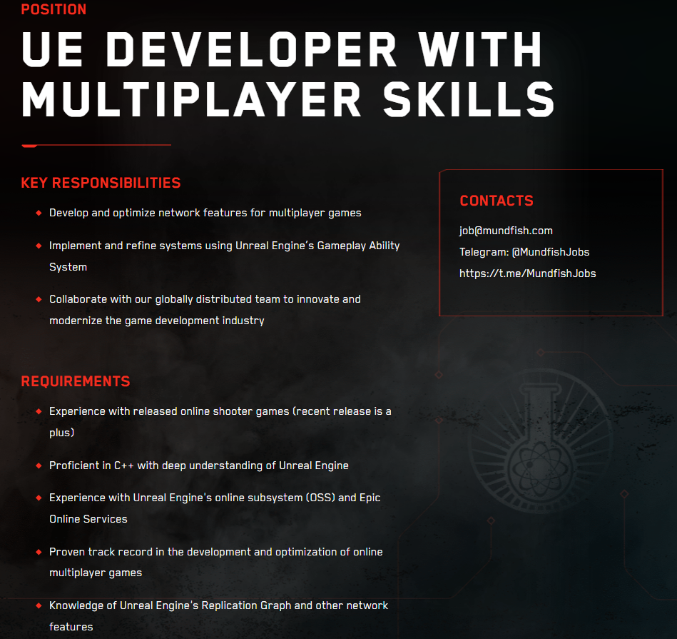 На официальном сайте Mundfish появилась вакансия, связанная с мультиплеером. Вакансия UE Developer with Multiplayer Skills подразумевает под собой: