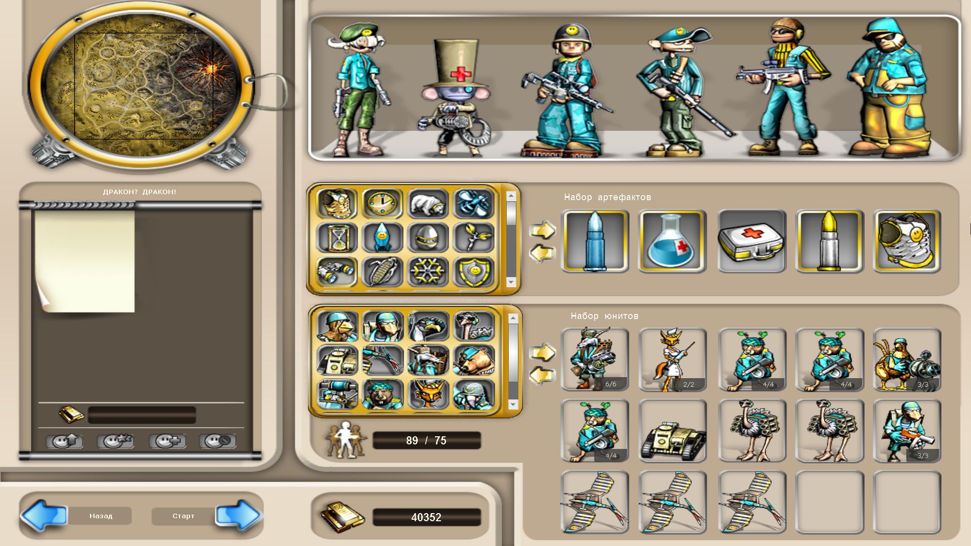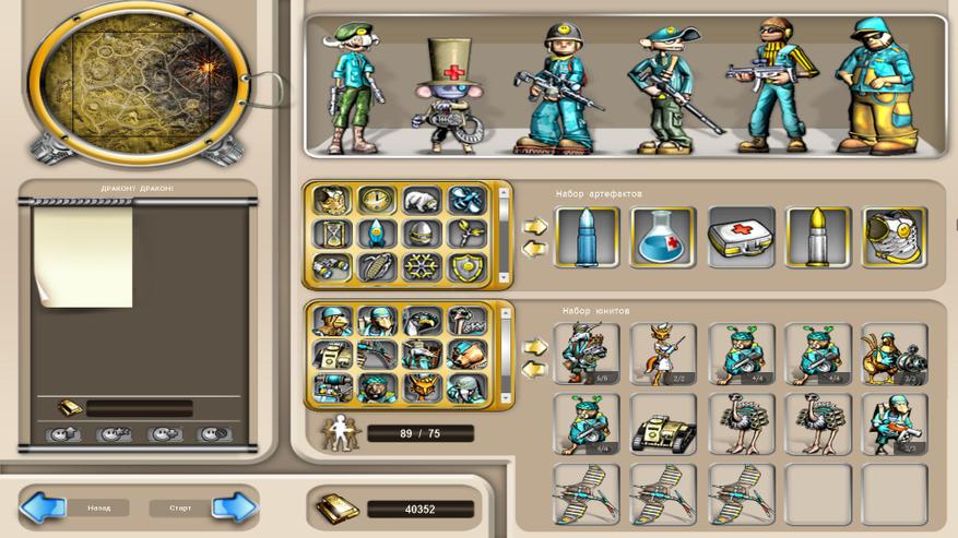 Перед началом очередной миссии предстоит отправиться в меню подготовки. Здесь можно просмотреть характеристики открытых героев и войск, подобрать необходимых бойцов для следующего задания, количество мест ограничено, и чем лучше боевая единица, тем больше она занимает «лимита населения». На выбор представлен огромный зоопарк войск: козлы с автоматами, кроты-гренадеры, медведи в тельняшках с РПГ, страусы с РСЗО и множество иных необычных сочетаний. Каждой боевой единице можно повысить уровень за отдельную доплату или по достижению третьего уровня улучшить войска до статуса элиты, что сильно поднимет все характеристики и некоторым дарует новые способности. Также именно в меню подготовки можно ознакомиться с полученными артефактами и подобрать необходимые для вашей игры. Всего имеется пять мест под предметы, отчего предстоит выбирать, делать упор на усиление войск, повышая им урон, защиту и атаку, а также давая регенерацию, или следует сделать сильнее героев.