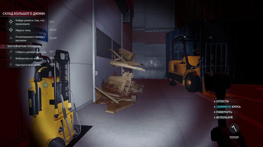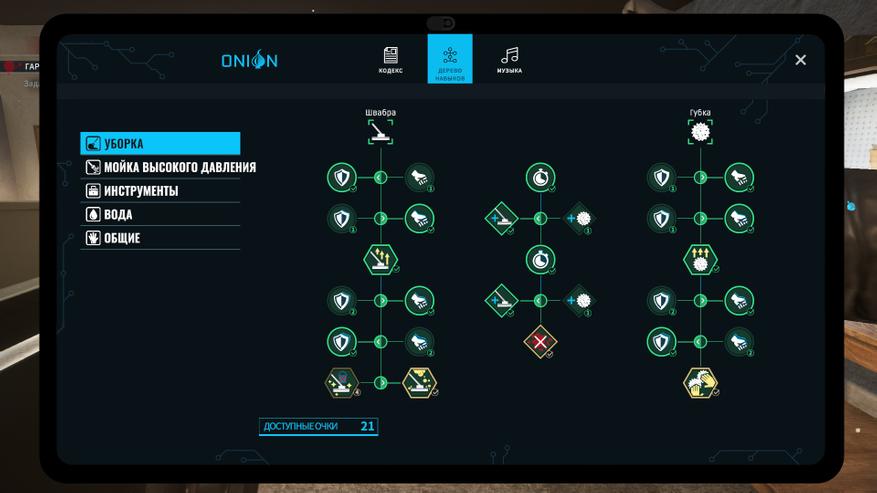 Начинается игра, как и во всех симуляторах, с минимальным набором инструментов низкого уровня. Но тут всё это логично объясняется: уборщик — профи, однако у него нет возможности купить себе много высококачественного оборудования. Кроме этого, он нигде не мог научиться работать с кровавыми пятнами, так что этот навык предстоит прокачать. Всего же в игре имеется пять разделов для прокачки: уборка, мойка высокого давления, инструменты, вода, общее. В каждой из категорий мы развиваем отдельные навыки или набор инструментов, и под конец игры в карманах нашего героя будет несколько вёдер, ящик моющих средств, три швабры и многое другое. В целом, если проходить игру на 100% (для этого надо убрать каждую локацию полностью), то к концу игры можно спокойно прокачать все навыки.