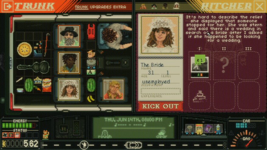 Впрочем, возможность начать сначала, а не играть дальше добавляет вариативности. Все квесты сбрасываются, местоположение обнуляется, а игроку даётся возможность выбрать другой маршрут или повторить прежний, чтобы посмотреть, как он изменится на другой машине, с другими попутчиками, с другими рандомными событиями.
