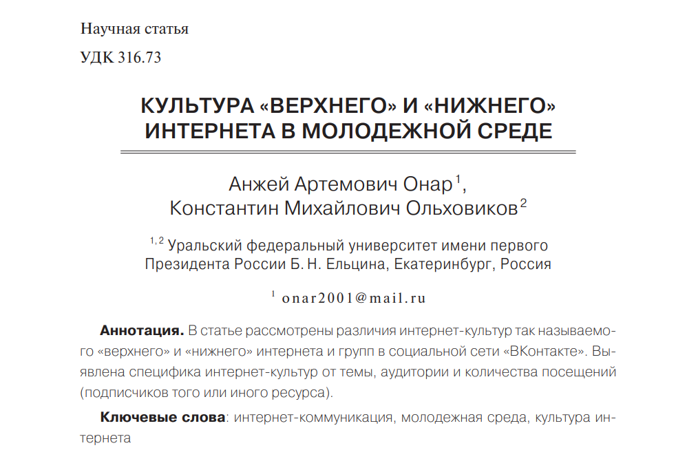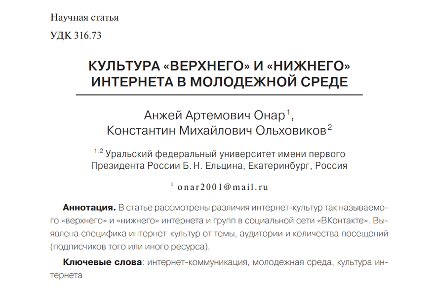 К моему большому удивлению, сегодня мы имеем интересную научную статью от Уральского федерального университета имени первого Президента России Б.Н.Ельцина по дисциплине «Динамика культуры»: «Культура «Верхнего» и «Нижнего» интернета в молодежной среде».