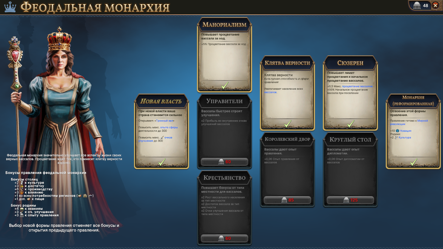 Несколько раз за игру Вам предложат выбрать внутреннее устройство государства. Это выбор между высоким и широким развитием и здесь он сильно завязан на взаимоотношениях с вассалами.
