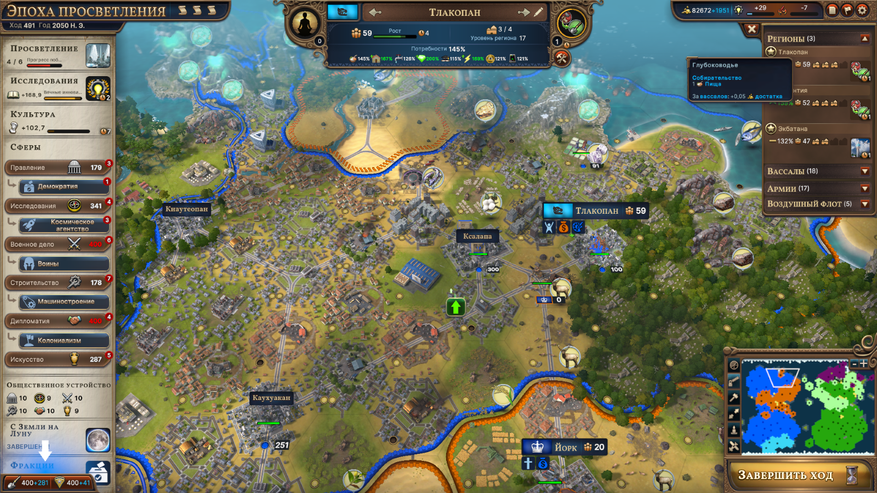 Застройка карты — увлекательный процесс. Многие игры про цивилизацию заканчиваются тем, что небоевая часть и внутреннее развитие оказываются менее интересными, чем война и завоевания, и Millennia определенно не из таких игр. Решать, что строить, где строить и как менять по мере продвижения по истории и расширения территории, очень приятно и затягивает на длительное вФинальная застройка