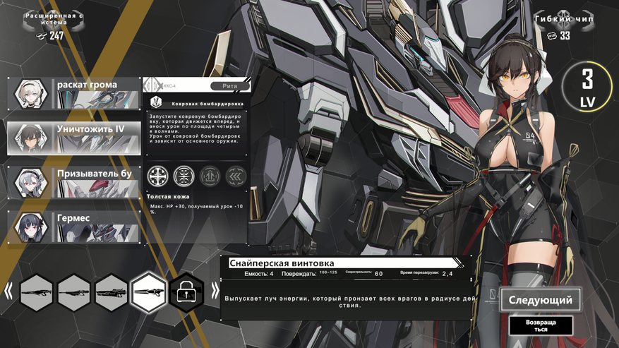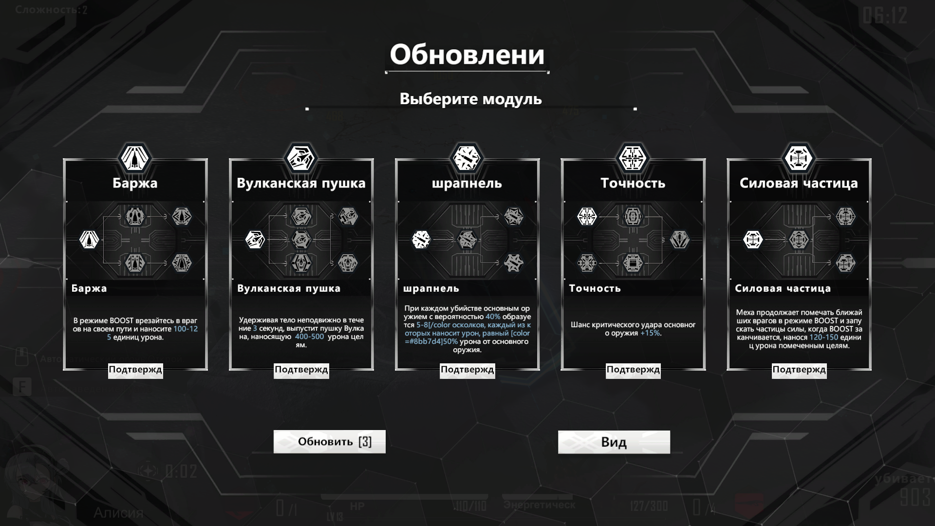 Меню Heavy Storm Shadow встречает вас с набором из четырех боевых мехов, каждый из которых обладает одним активным и четырьмя пассивными умениями. Кроме того, в вашем арсенале будет пять различных пушек, из которых вы сможете палить по врагам, и пять слотов для чипов, которые вы сами сможете выбрать, чтобы улучшить свои характеристики. Всё это позволит вам настроить своего меха под ваш стиль игры и предпочтения. Гибкость настроек позволяет вам создать своего уникального и неповторимого бойца.