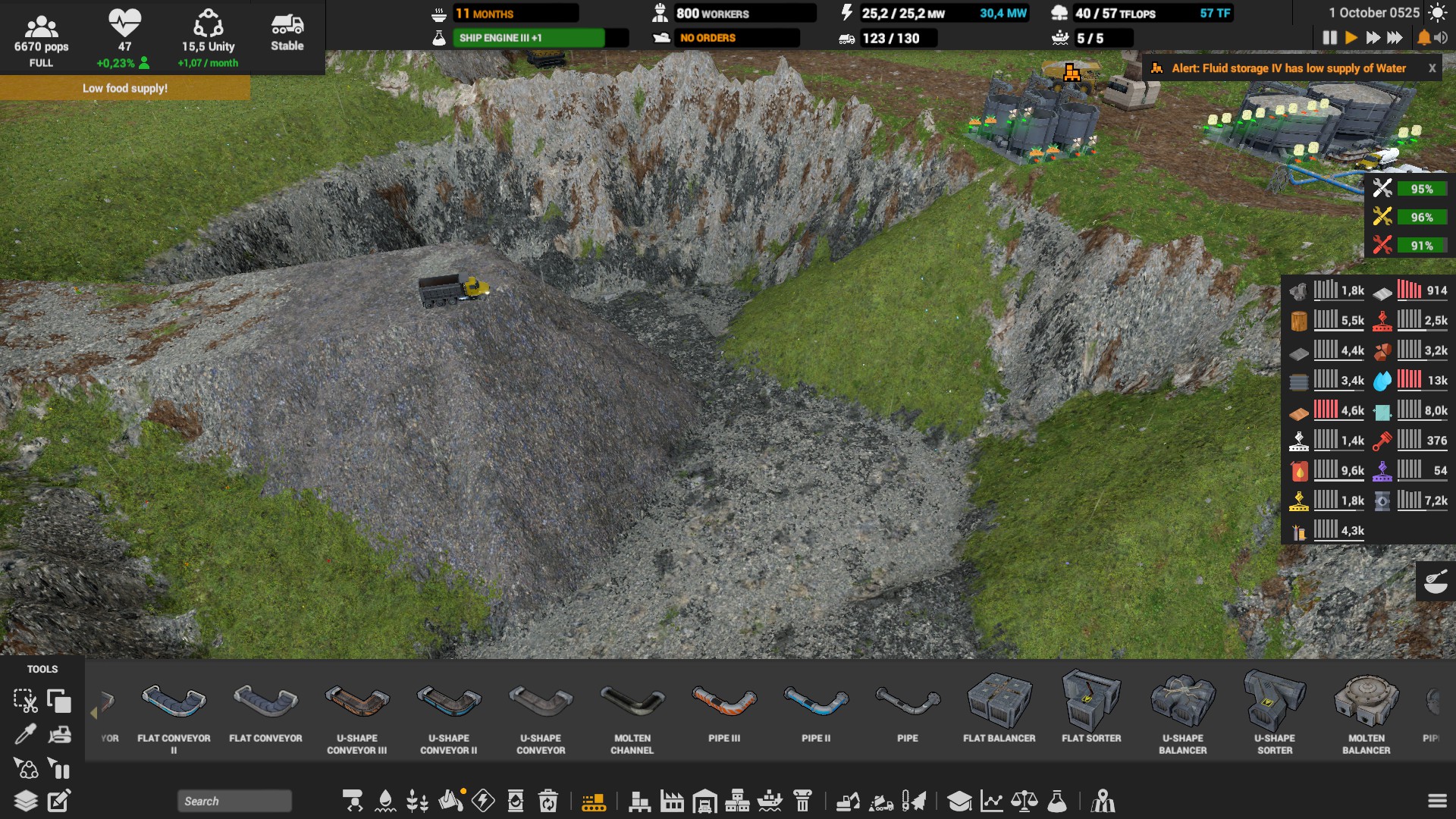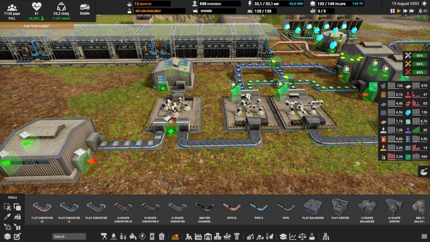 Заводострой - не заводострой без возможности нагромоздить адское хитросплетение конвейеров и труб. Конвейеры, правда, в Captain of Industry становятся доступны вовсе не сразу, так что поначалу придётся всю продукцию возить на пикапах. В дальнейшем же лучше тщательно планировать, как конвейерно-трубные трассы сочетаются с автомобильными. Идущая прямо на уровне земли труба, очевидно, не даст грузовикам проехать. Но трубы с конвейерами можно прокладывать и с поднятием над землёй. Помимо уровня земли есть ещё три условных "этажа" высоты. Однако, грузовики и пикапы могут проехать только под трассами, идущими на втором и третьем этажах. А экскаваторы, лесопильные комбайны и карьерные самосвалы вообще ни под какой высотой не пролезут. Зато над идущими на уровне земли конвейерами можно возвести специальные рампы, по которым уже любая техника ездит без проблем. В результате небольшой недосмотр способен привести к тому, что ловко уложенные в четыре слоя трубы перегородили подъезд к складу со стройматериалами, и встало всё текущее строительство. Поэтому как минимум придётся отслеживать, чтобы от машиностроительного депо до всех мест добычи ресурсов имелись не перекрытые конвейерами пути. Иначе новенькие экскаваторы до карьеров не доедут.