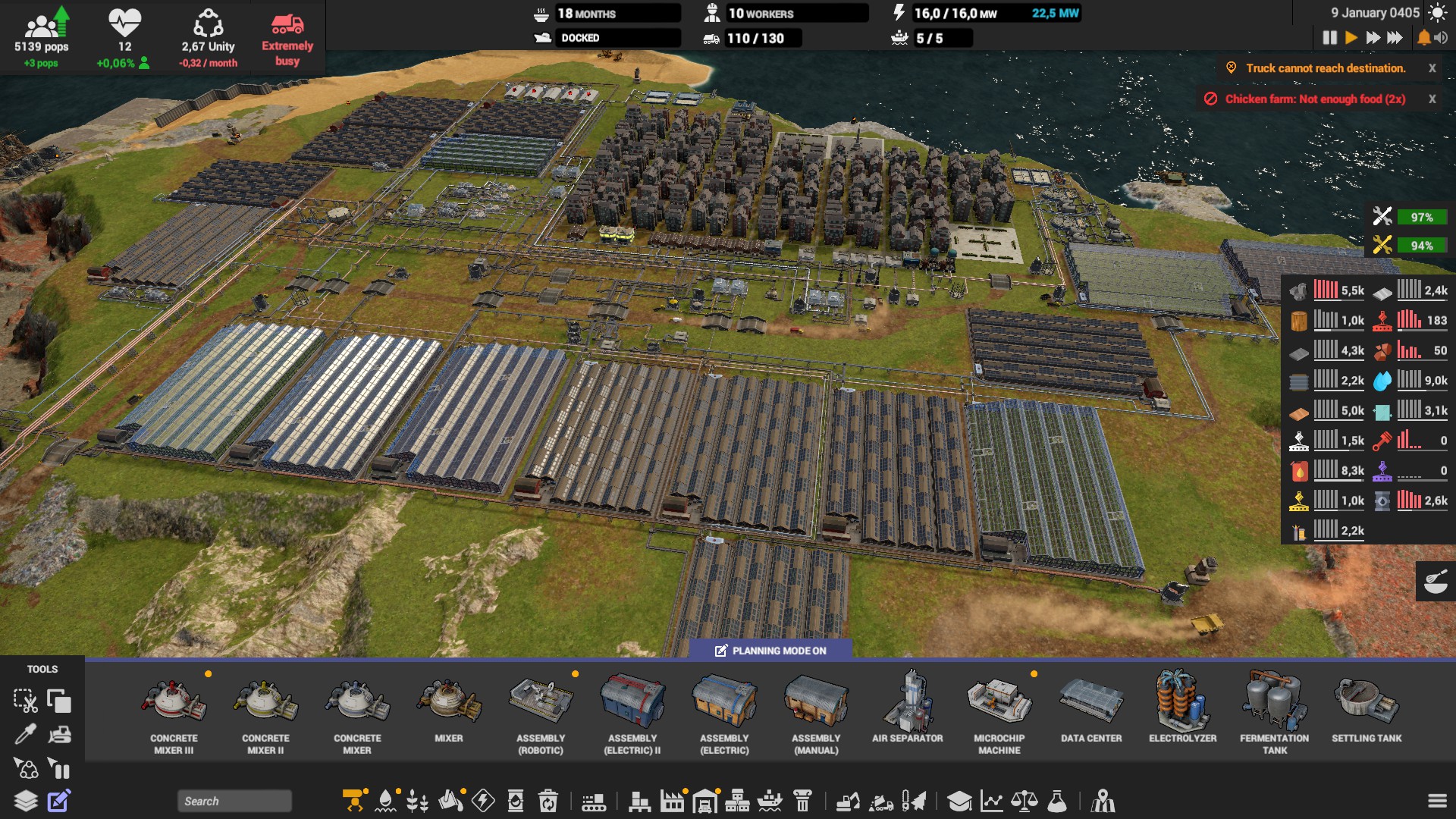 Собственно, так гораздо удобнее, чем через всю карту вести своего инженера ставить новый бур. Вдобавок, есть режим планирования - если размещать здания в нём, их строительство автоматически ставится на паузу и грузовики не будут сразу бросаться возить ресурсы на место стройки. Ещё есть функции, которые дают скопировать уже отстроенные/запланированные конфигурации, что сильно помогает при создании более-менее масштабных производств. Не хватает только системы чертежей, как в Factorio, чтобы придуманные дизайны сохранить в книжечку, а потом из неё в любой момент достать и на местности разместить.