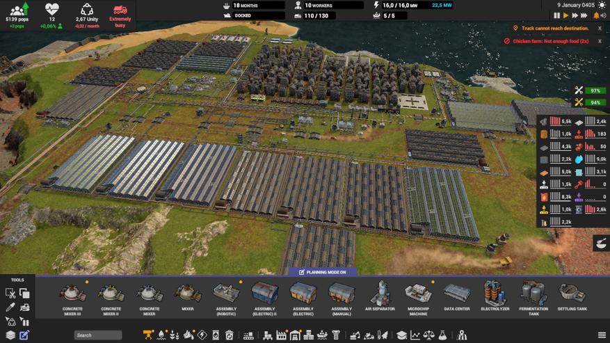 Ближе к финалу, когда добираешься до всяких компьютеризированных и роботизированных штук, оказывается, что для них нужны отдельные виды запчастей и постоянный доступ к вычислительной мощности. Последняя вырабатывается путём установки серверов в дата-центры и имеет тенденцию к постоянной нехватке. Да и от взгляда на то, во сколько этапов кремниевая "вафля" превращается в микрочип (а потом на нужное для нормальной работы количество этих чипов) становится не по себе. Но при некоторых терпении и изобретательности все эти проблемы, разумеется, со временем решаются.