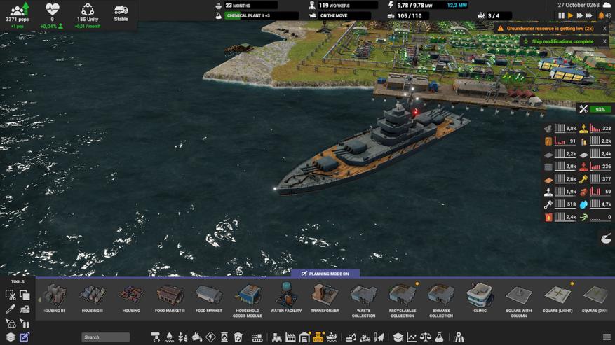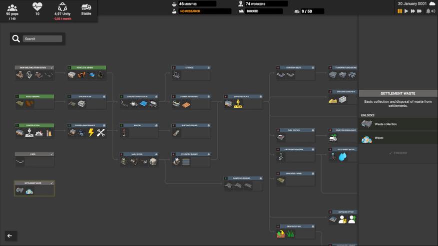 Помимо показателя здоровья, есть скорей даже не показатель, а ресурс "единство" (unity). Он отображает, как мне показалось, некий общий энтузиазм населения и расходуется на массу процессов. Работа всех добывающих мощностей вне острова, обслуживание контрактов и изыскания в лабораториях потребляют единство на постоянной основе. Если баланс единства положительный, то оно накапливается и этот запас можно тратить, чтобы поменяться ресурсами с другим поселением, привлечь оттуда людей или мгновенно возвести что-нибудь, не дожидаясь грузовиков. Откуда же единство берётся? А как раз от хорошей жизни рабочих. Более качественное жильё, разнообразное питание, обеспеченность медициной, водой, электричеством и всякими товарами для дома дают прирост единства. Также его можно получить, украсив город площадями и своевременно вывозя мусор. Последнее очень важно, потому что жизнь в загаженном городе людей сильно угнетает.