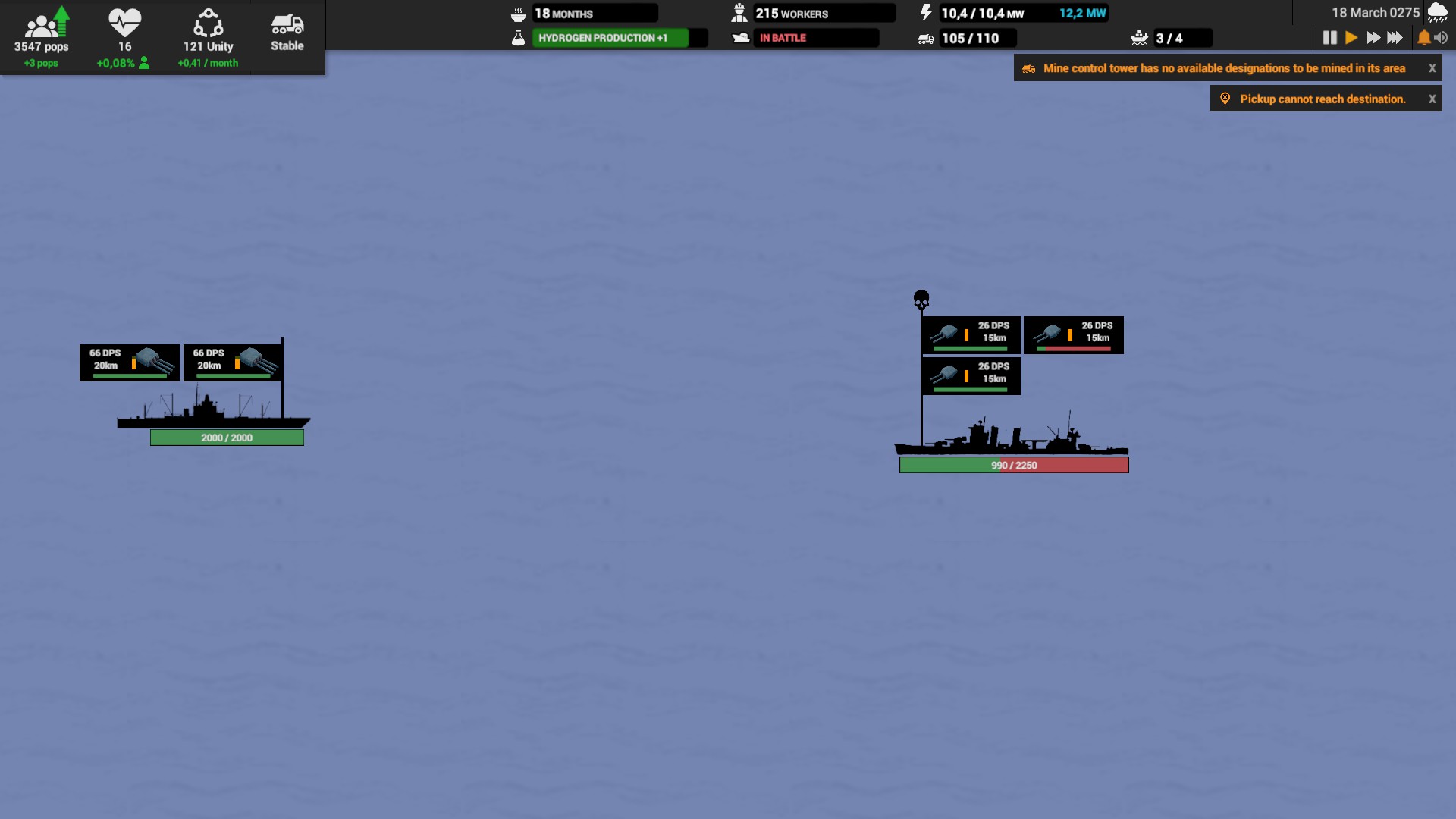 Плотная взаимоувязанность всех процессов в игре заставляет постоянно держать руку на пульсе ситуации и думать наперёд. Любой недосмотр может вызвать крайне негативное развитие событий, которое сложно будет остановить. И авария на ядерном реакторе - это ещё самое простое и понятное. Например, если неудачно проложить водоснабжение, или вовремя не построить дополнительные опреснители, получаем недостаток воды на фермах и в посёлке. Единство просаживается до нуля, прекращаются внешние поставки нефти, кончается горючее у кораблей, которые эту нефть и возили, встают грузовики и экскаваторы, встаёт производство лекарств, удачно наваливается болезнь, народ мрёт, начинают вставать другие производства. Это я, конечно, нечто очень экстремальное придумал, но водяные кризисы меня периодически настигали. Как и перебои с запчастями, из-за которых всё надолго стопорилось. Или дисбаланс в распределении солярки приводил к сложностям с доставкой нефти. Или неудачная разметка карьера срывала подачу угля в котлы, что вело к проблемам с водой и электроэнергией. А если ещё и болезнь в эти моменты настигала то вообще становилось хорошо. В общем есть много способов погубить свою фабрику без всякой внешней угрозы.