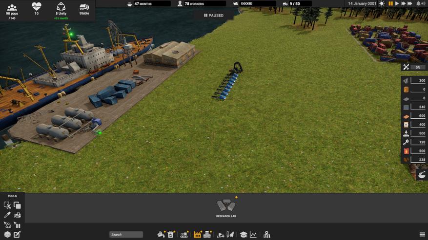 Правда, на старте ничего добывать, производить и выращивать островитяне не умеют. Могут только выплавлять железо из лома, создавать уголь из дерева (разделения на древесный и каменный уголь нет, но первый всё равно только в начале бы и фигурировал скорее всего) и прокладывать трубы. Поэтому первым делом надо как раз отстроить лабораторию, чтобы наработать новых технологий. Наука в Captain of Industry работает привычным способом - лаборатории потребляют специальный ресурс - научное оборудование - и потихоньку ведут исследование выбранной технологии. Но для начальных исследований ничего, кроме времени, тратить не надо, поэтому базовые вещи становятся доступны без всяких затруднений.