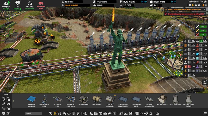 Зато с подводом электричества к объектам возиться не надо. У разработчиков есть в планах создать систему раздающих электричество подстанций, но на текущем этапе развития игры достаточно просто вырабатывать нужное количество мегаватт.