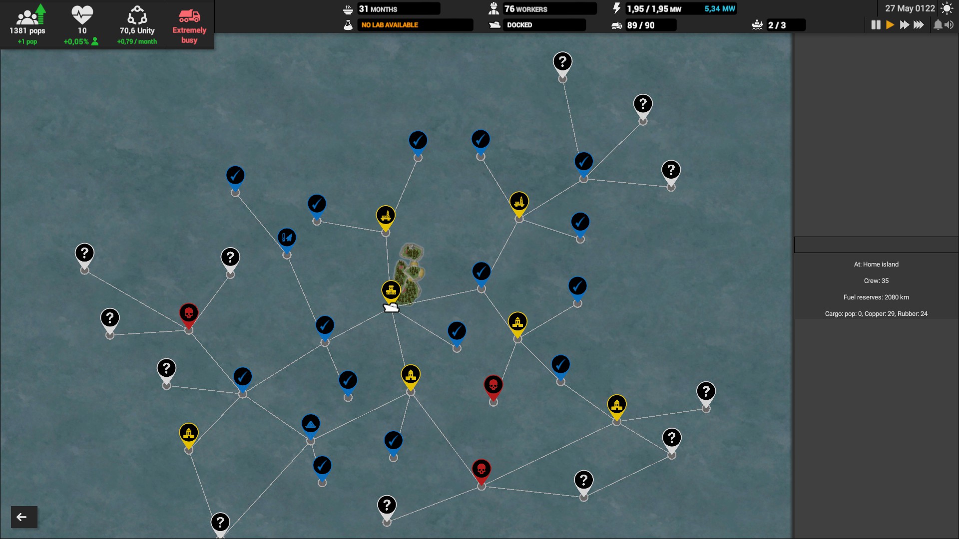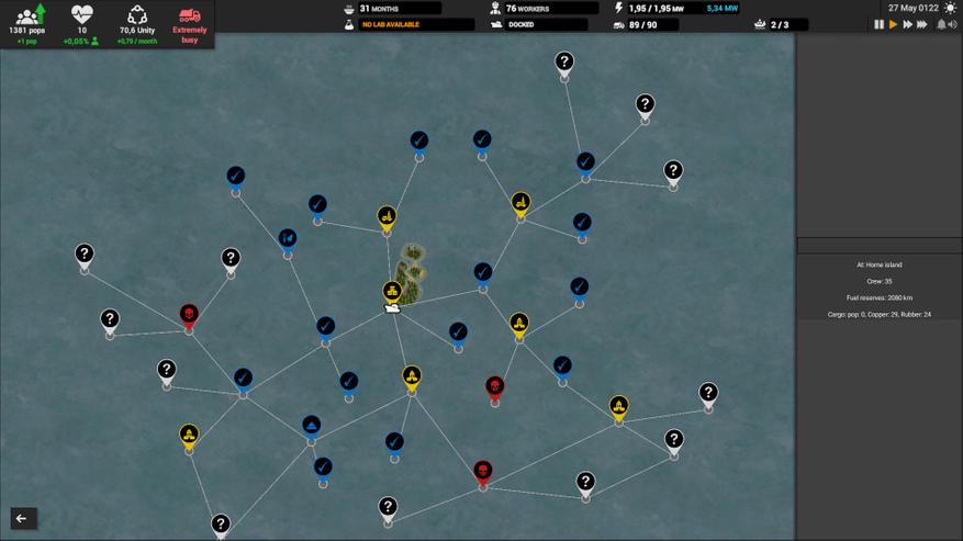 С самого начала игра нам сообщает, что на Земле мы не последний оплот разумной жизни, и рядом есть другое поселение. Починив верфь и корабль, можно отправить последний в путешествие по местной глобальной карте, которая выглядит как множество связанных условными "путями" локаций. В каждой из локаций можно найти либо просто какие-то припасы, либо новое поселение, либо источник ресурсов.