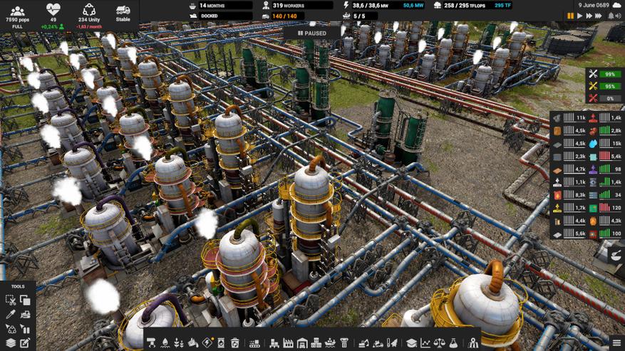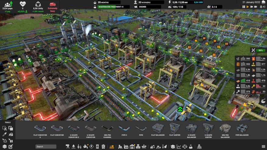 Подобная дотошность характерна и для изображённых в игре технологических процессов. Металлургия, изготовление стройматериалов, производство электроники, переработка нефти - всё имеет несколько стадий, промежуточных и побочных продуктов. Например, выплавка железа требует не просто закинуть в домну уголь и соответствующую руду, а потом слить расплав по специальному каналу. Помимо расплавленного железа на выходе образуются шлак и выхлопные газы. Газы можно вывести в дымовую трубу, отравив немножко атмосферу, шлак же придётся куда-то сгрузить, а потом высыпать в отвал. Но есть и другие варианты - часть шлака пригодится для производства бетонных блоков, а выхлоп можно разложить в специальных установках, получив серу, пар и углекислый газ. Которые тоже надо куда-то направить.