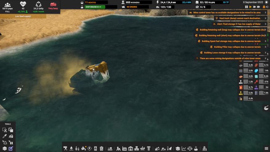 В результате приходится натурально проектировать карьеры, учитывая как туда будут въезжать грузовики, не рухнут ли в растущую бездну стоящие рядом здания, стоит ли ставить специальные "подпирающие" стены, и куда деть извлечённый материал. А если копать рядом с береговой линией, то карьер может ещё и затопить. Техника не погибнет, но придётся её вывести, всё засыпать, отгородить доступ воде и снова откапывать. Особняком на этом фоне стоит только добыча нефти, где достаточно поставить над месторождением качалки и кинуть от них трубу к нефтехранилищу.