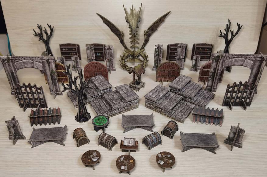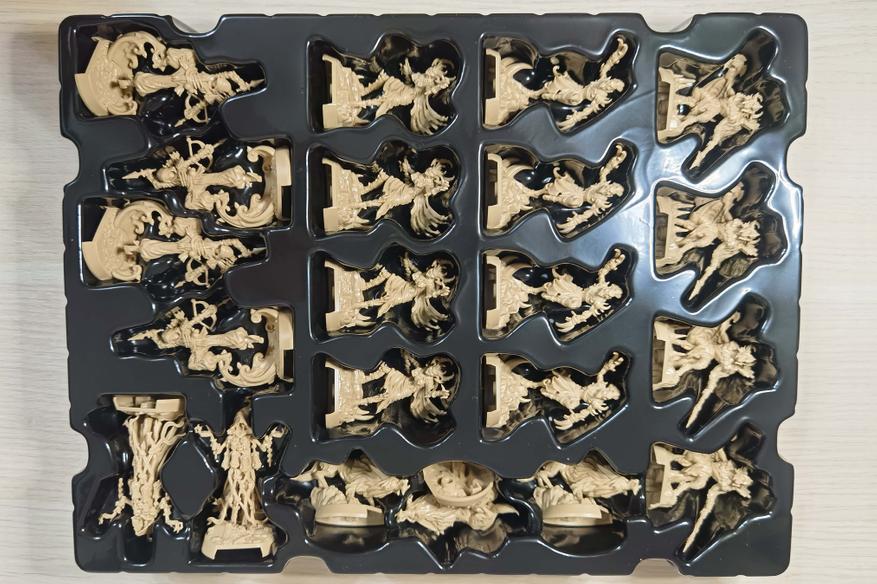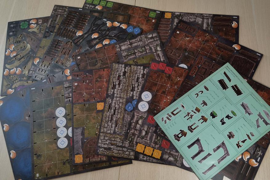 Первым делом разработчики предлагают вспомнить навыки конструирования: из картонных планшетов предстоит выдавить различные элементы, а затем собрать из них деревья, сундуки, колонны, врата, шкафы, столы, лестницы, баррикады, колодец, котел и даже огромного костяного дракона. К счастью, в комплекте идет подробная инструкция. Элементы, за исключением подставок деревьев, неплохо сцепляются без использования клея. Также потребуется скрепить счетчики жизней и выдавить жетоны. Процесс сам по себе довольно увлекательный, и занял у меня целый вечер.
